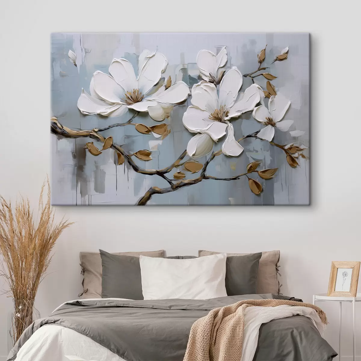 Obraz Biele kvety magnólie s textúrovanými okvetnými lístkami a hnedými listami na jemnom modrom pozadí imitácia olejomaľby Nr. s42711