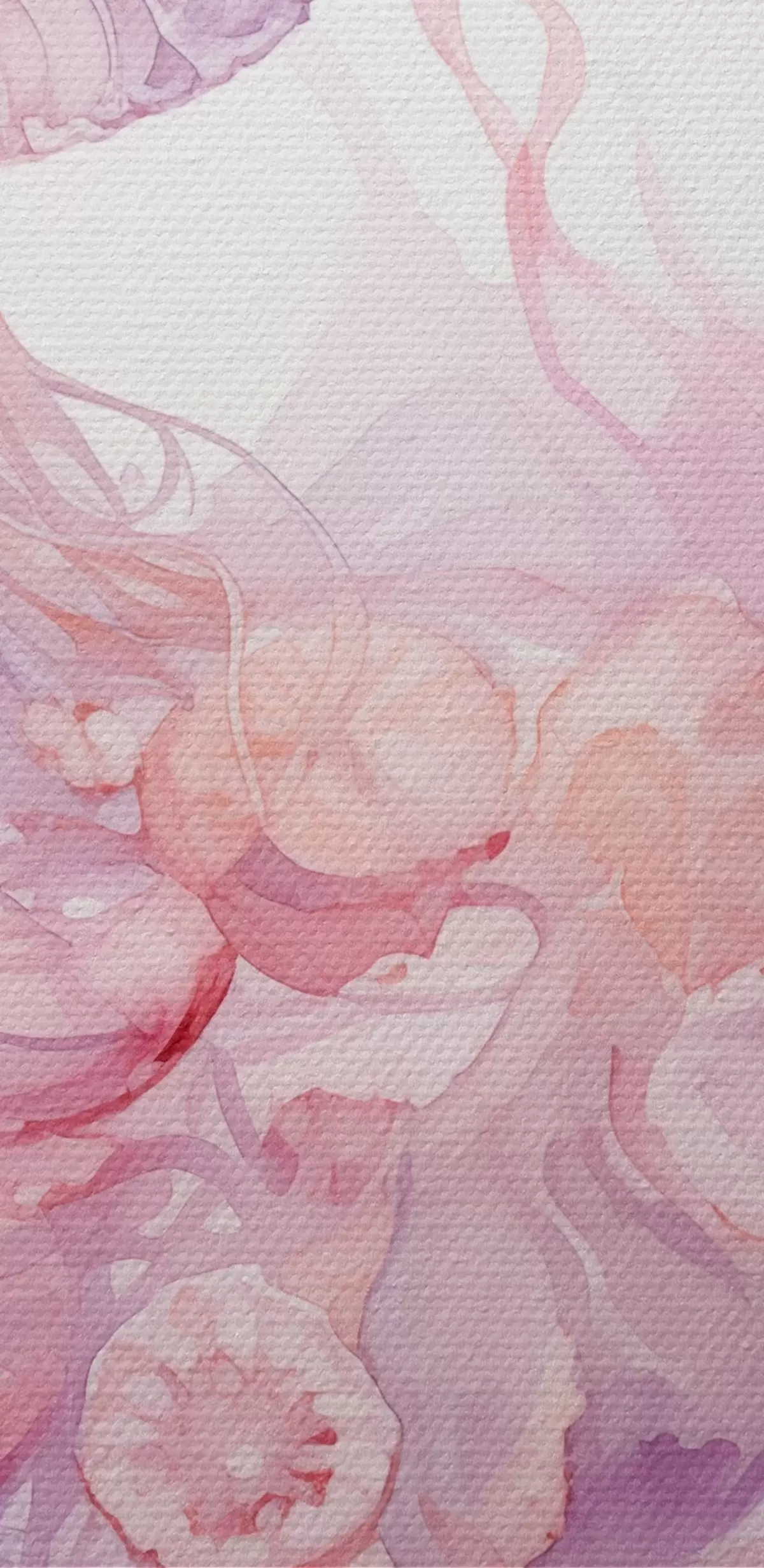 Obraz Ružové medúzy plávajúce vo víre jemných ružových a fialových odtieňov, obklopené abstraktnými tvarmi Nr. s42730