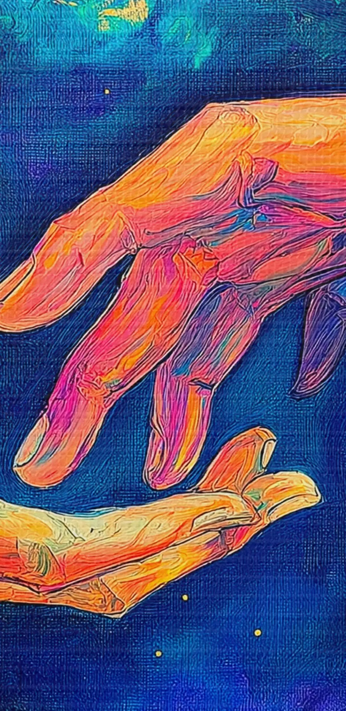 Obraz Abstraktná kompozícia dvoch rúk siahajúcich po sebe v žiarivej farebnej palete na kozmickom pozadí Nr. s42937