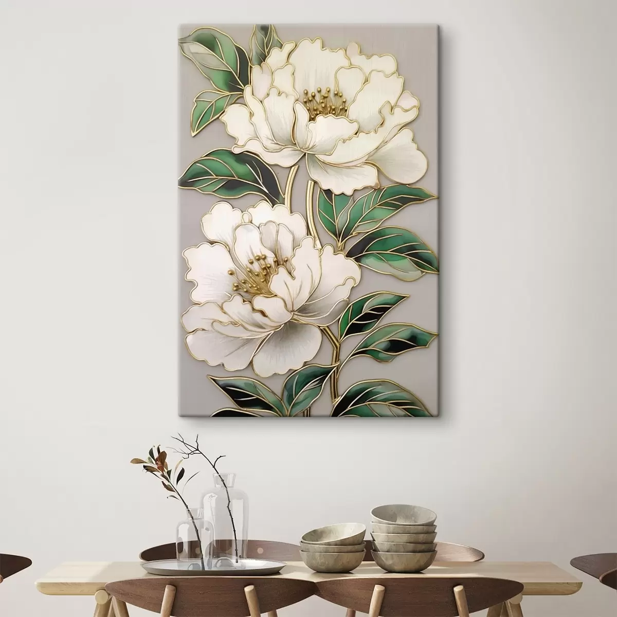 Obraz Biele kvety so zelenými listami v dekoratívnom usporiadaní Nr. s43011