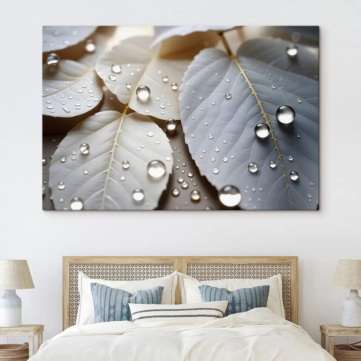 Obraz Detailný záber na biele listy pokryté kvapkami vody, minimalistická kompozícia, neutrálne pozadie Nr. s43159