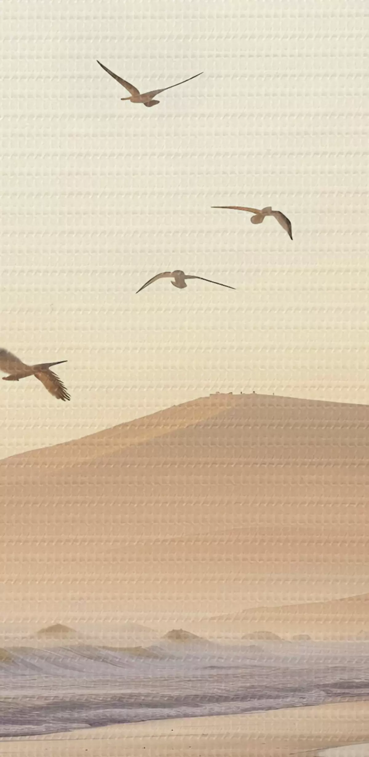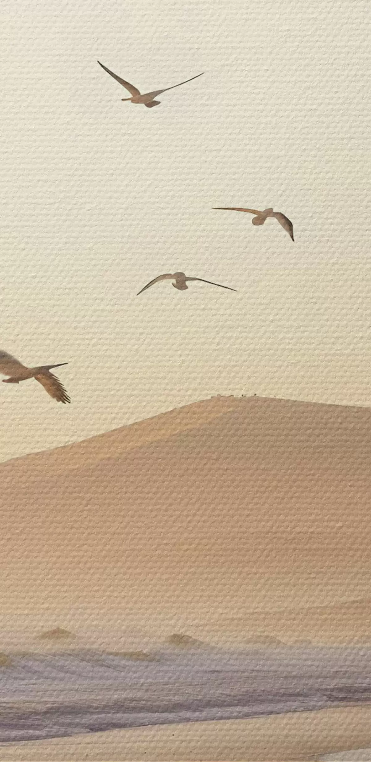Obraz Vtáky lietajúce nad plážou s oceánom, hory v pozadí, teplé farby, jemná pastelová paleta Nr. s43162