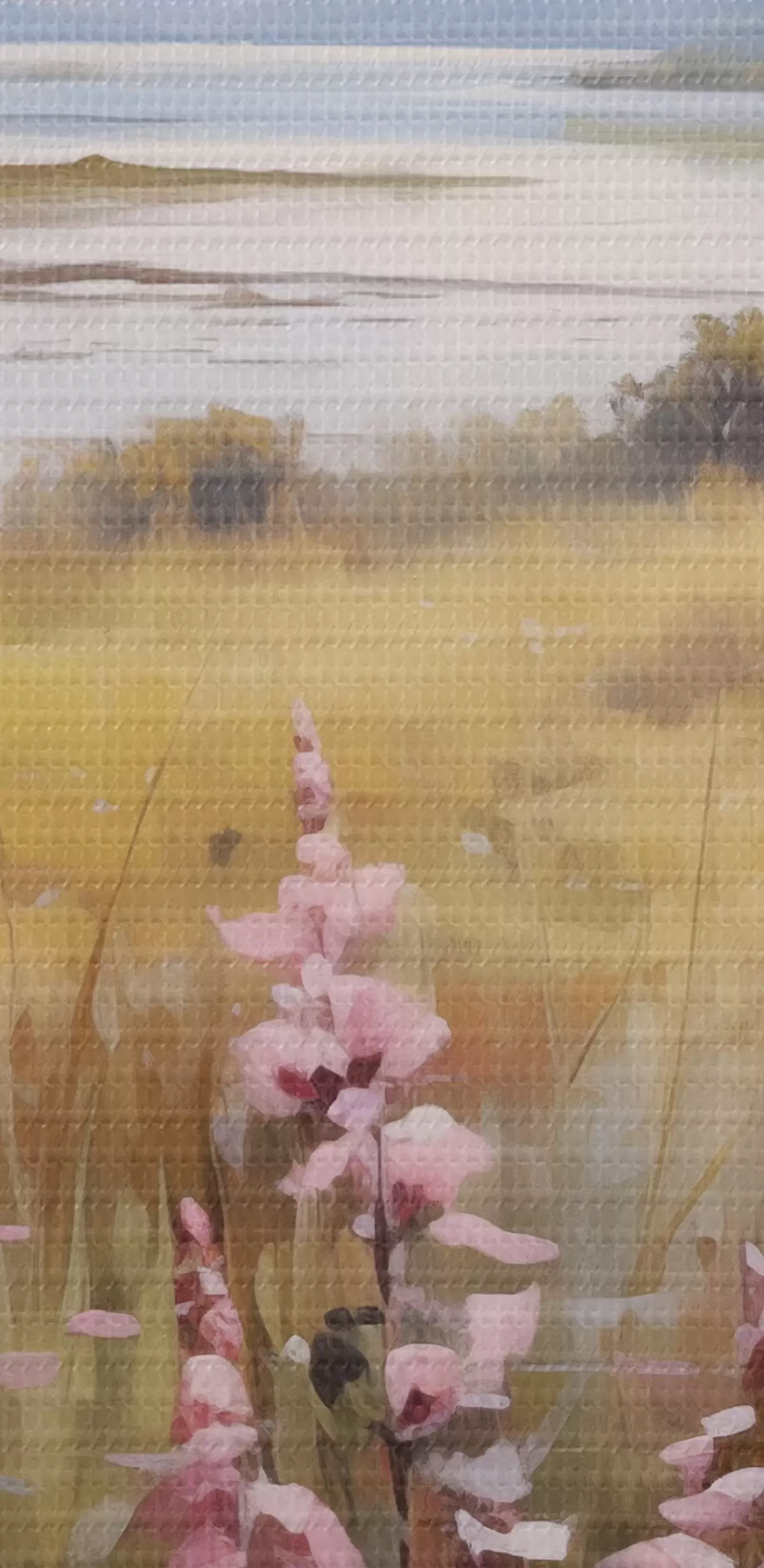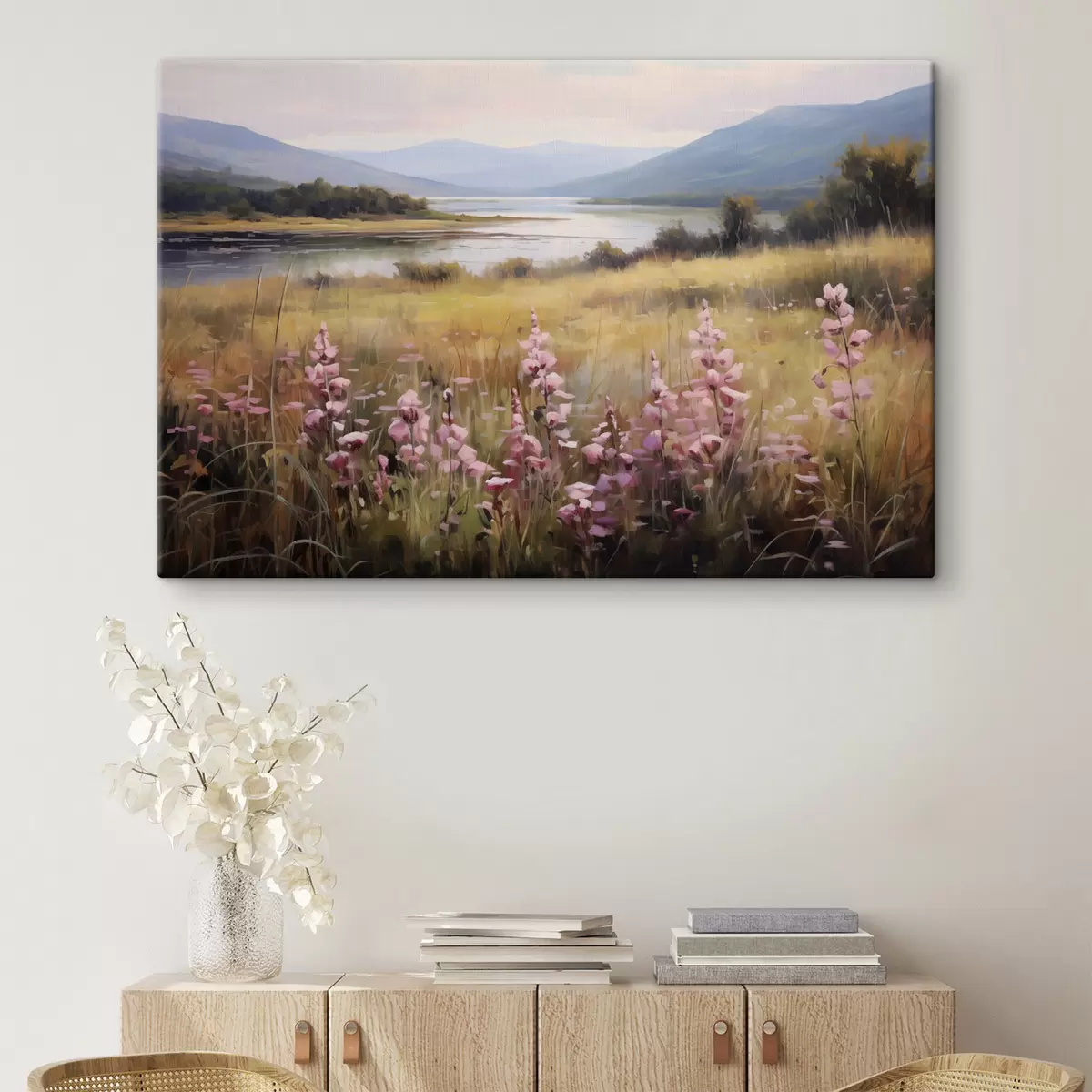 Obraz Krajina s poľom ružových kvetov, jazerom a horami v pozadí, pod zamračenou oblohou Nr. s43165