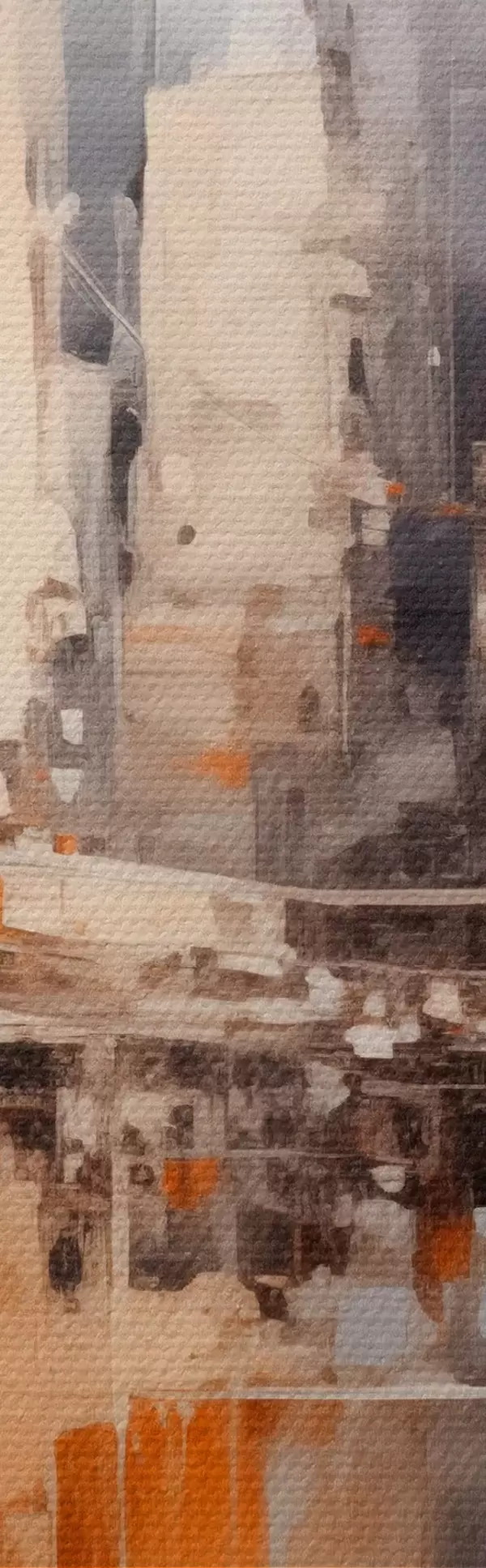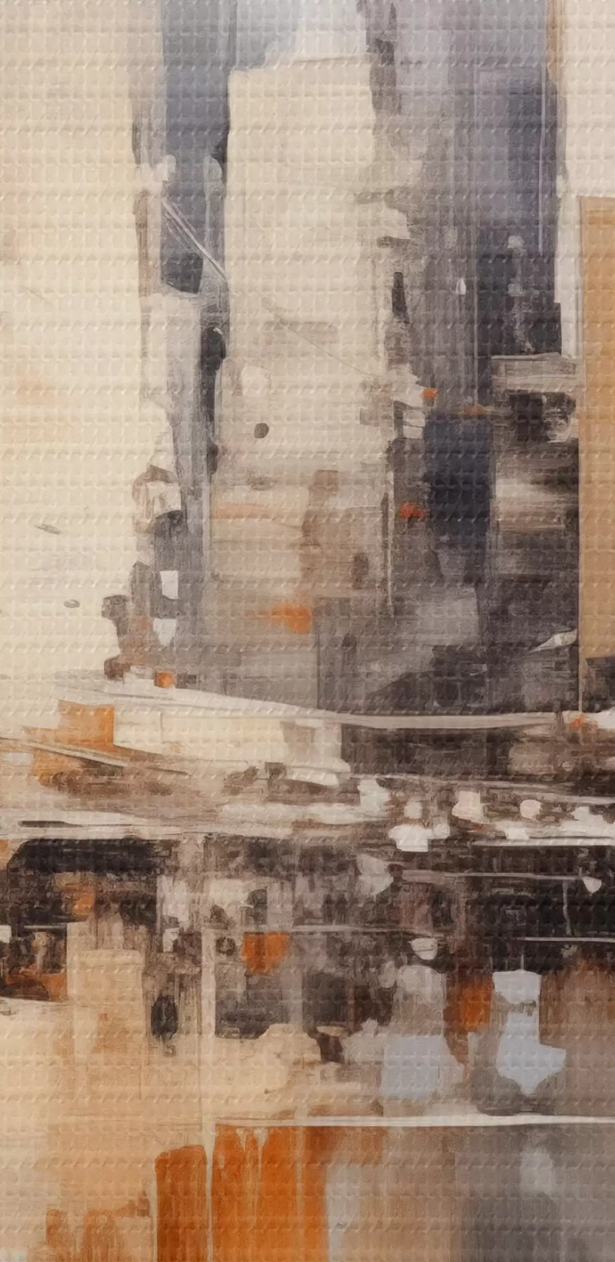 Obraz Abstraktná maľba mestskej krajiny s vysokými budovami v odtieňoch hnedej, sivej a bielej farby, ktoré sa odrážajú vo vode pod nimi Nr. s43168