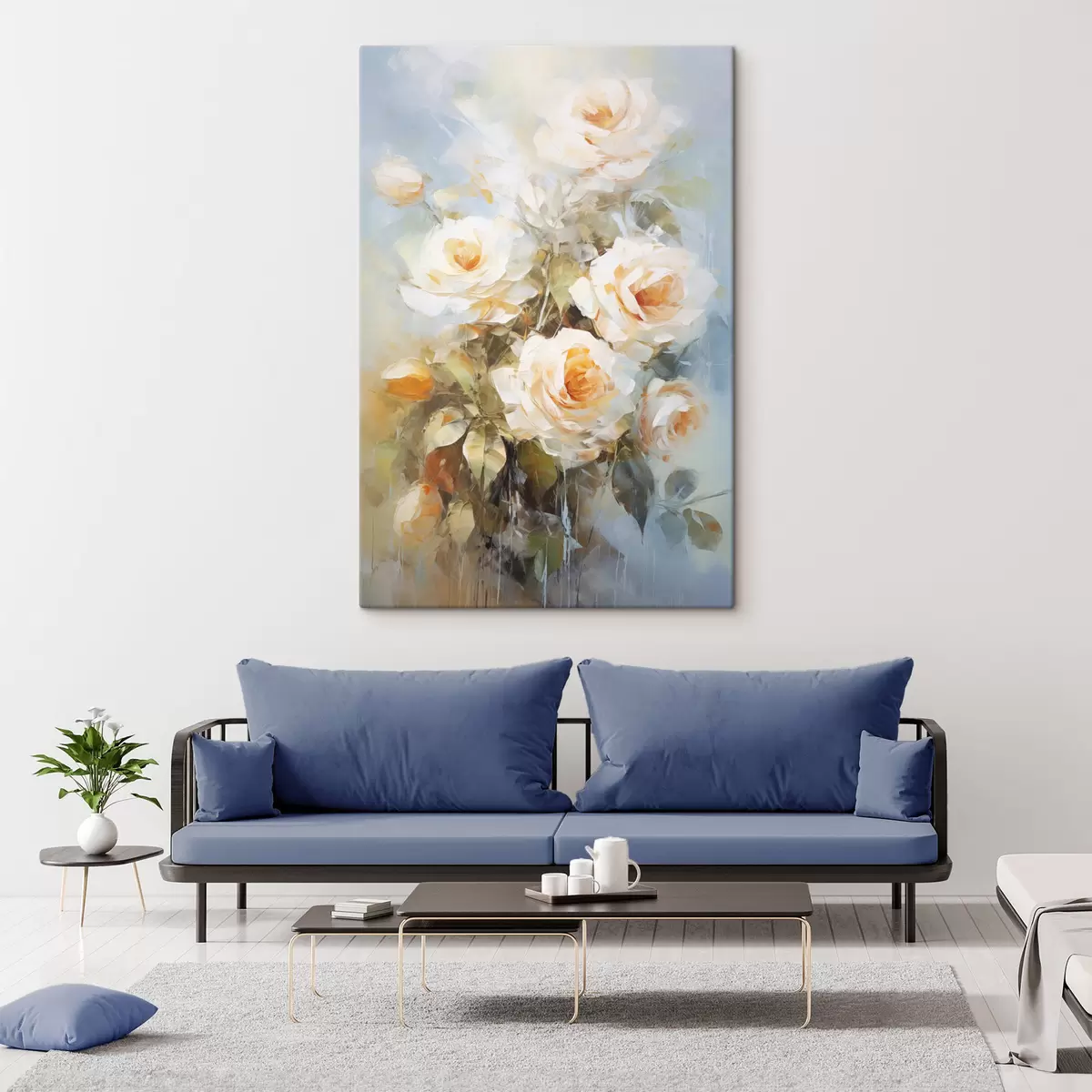 Obraz Biele ruže s oranžovou farbou na jemnom, svetlomodrom pozadí, s viditeľnými ťahmi štetca a maliarskym štýlom Nr. s43175