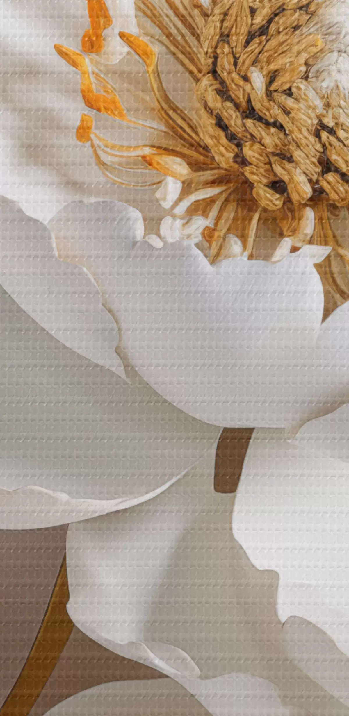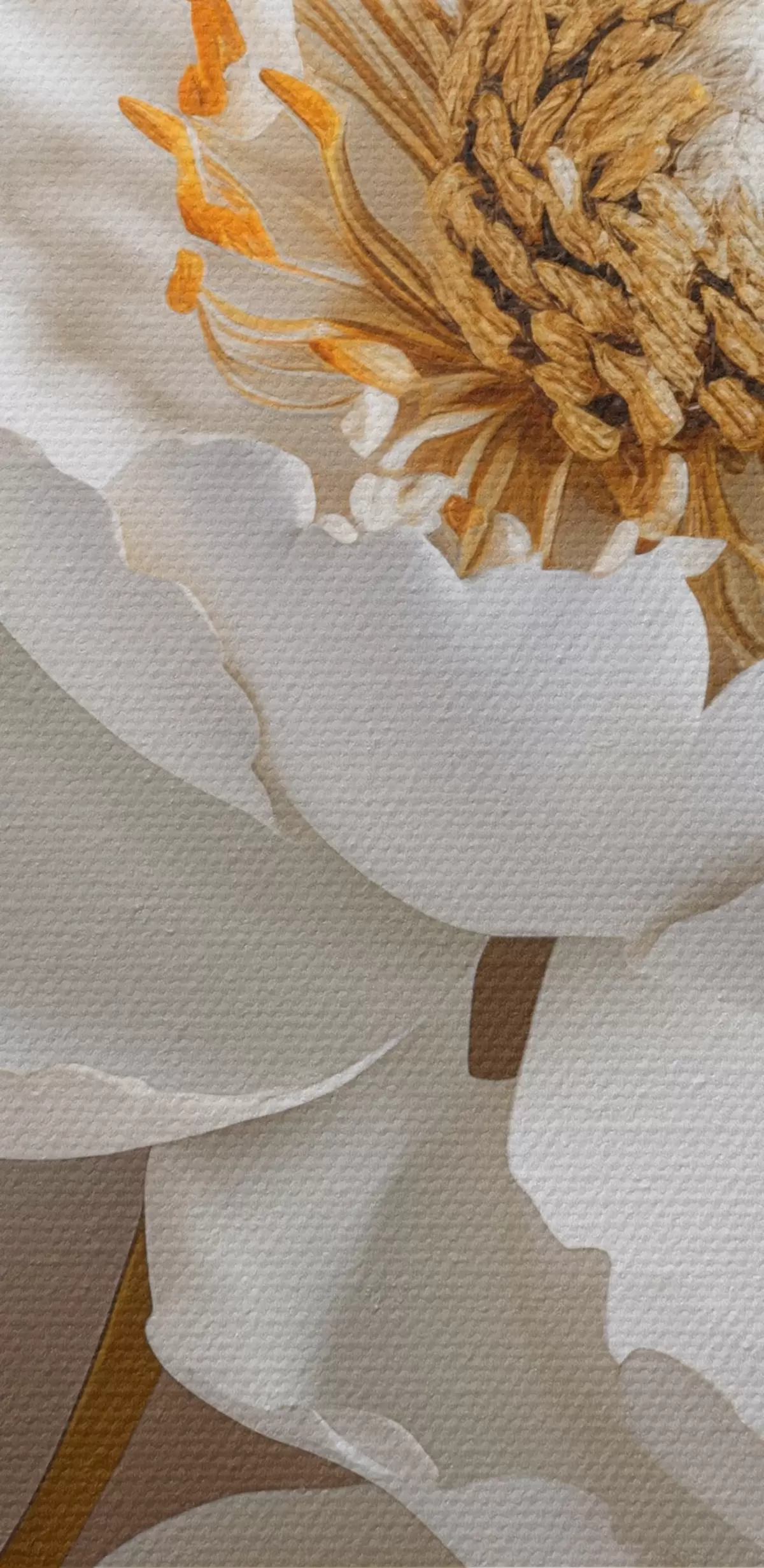 Obraz Biele jemné detailné dekoratívne kvety pivonky so žltými listami, pozadie je svetlosivej farby Nr. s43176