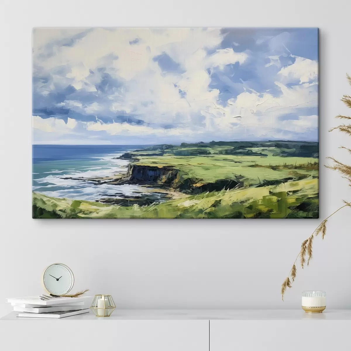 Obraz Zelené pole s útesom na pobreží, modré more s vlnami, zamračená obloha, minimalistická imitácia modernej olejomaľby Nr. s43406