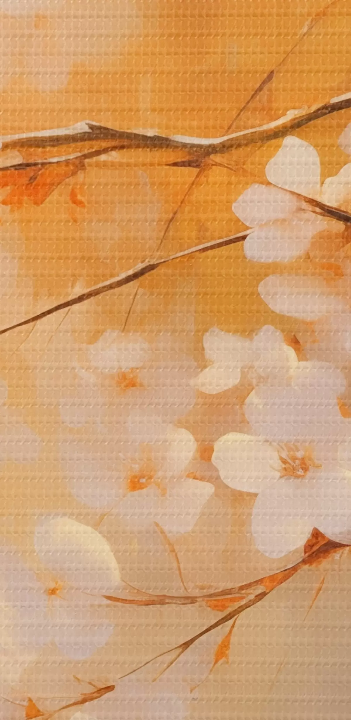 Obraz Vetvy čerešňového kvetu s oranžovými kvetmi, teplá paleta farieb, na rozmazanom pozadí žltých odtieňov Nr. s43407