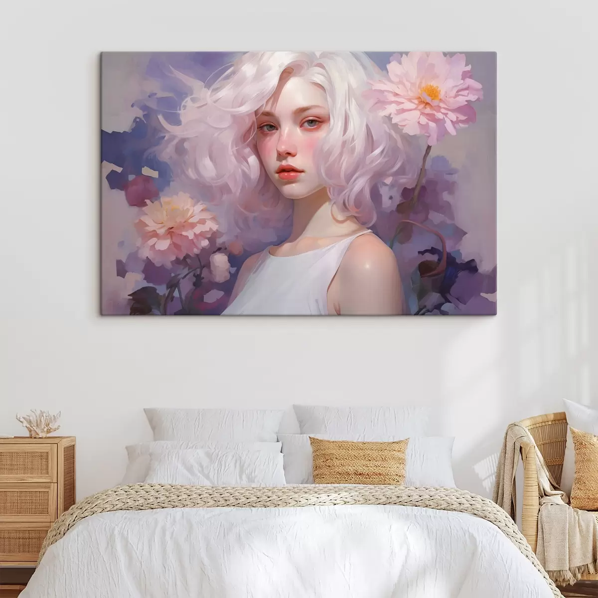 Obraz Krásne dievča v kvetoch, akrylová kresba, Japonsko, fialové farby Nr. s43495