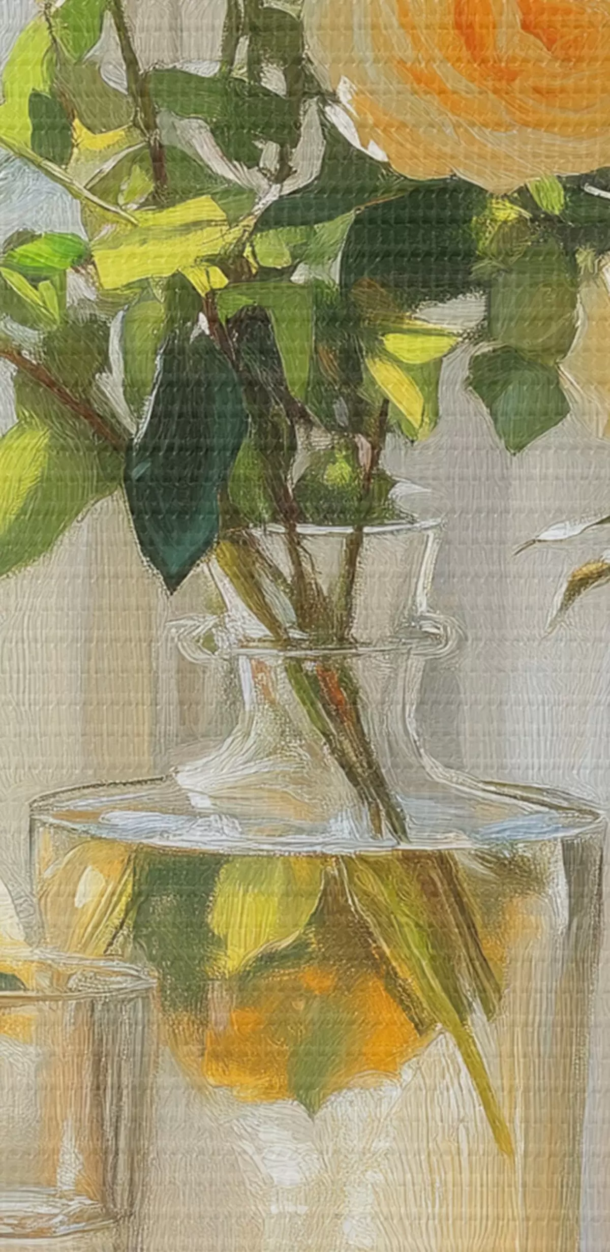 Obraz Ruže vo váze, olejová kresba, jemné slnečné svetlo, citróny, jar Nr. s43887