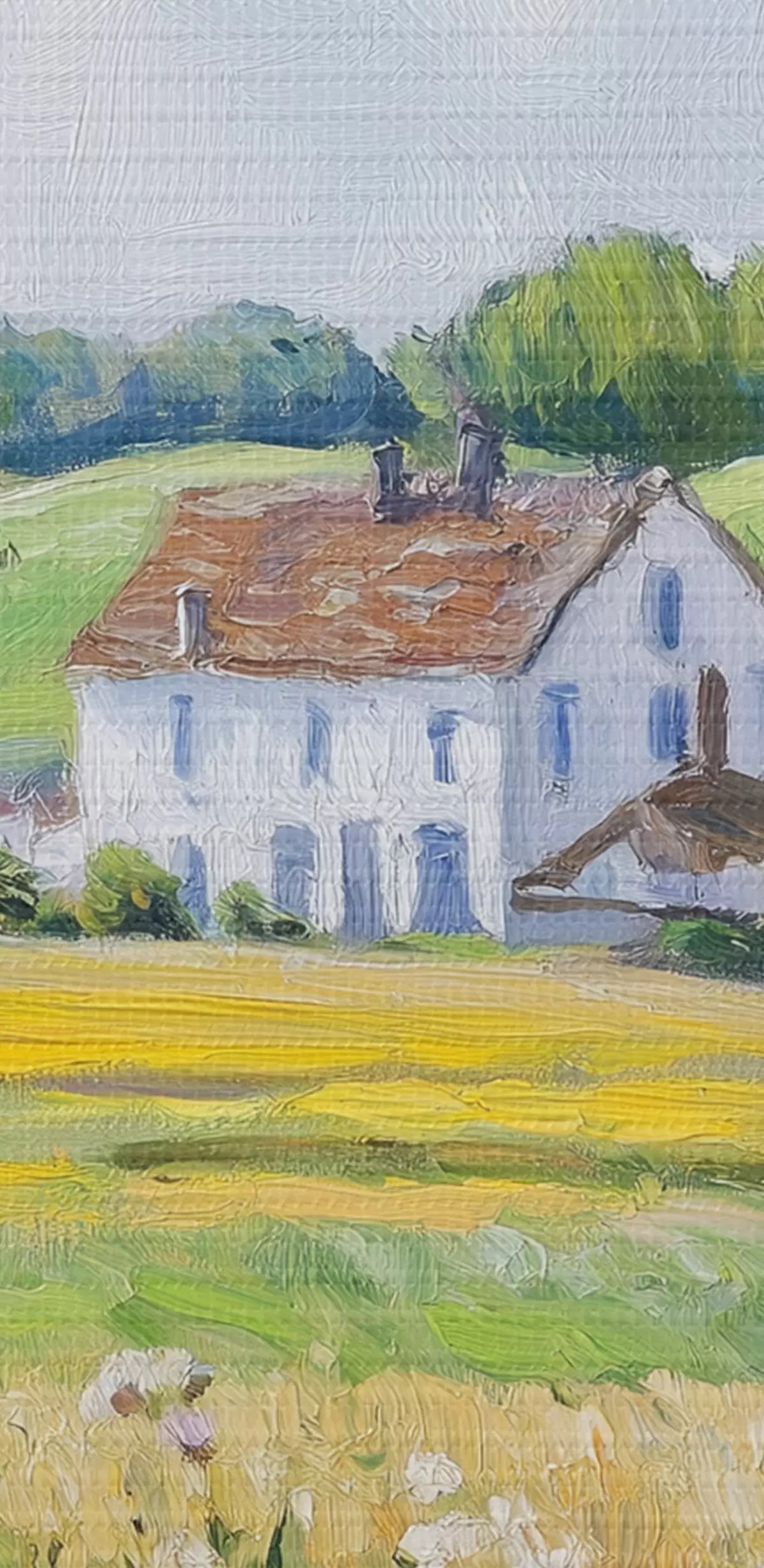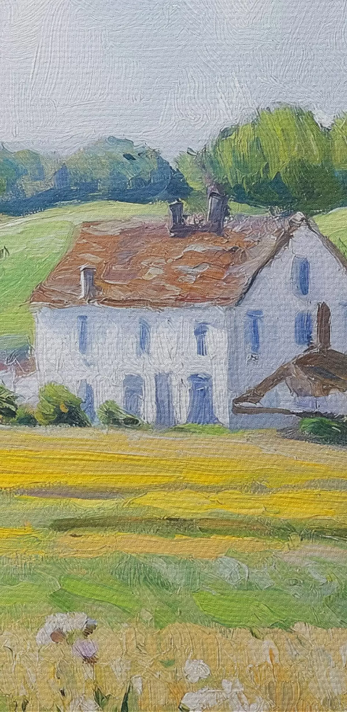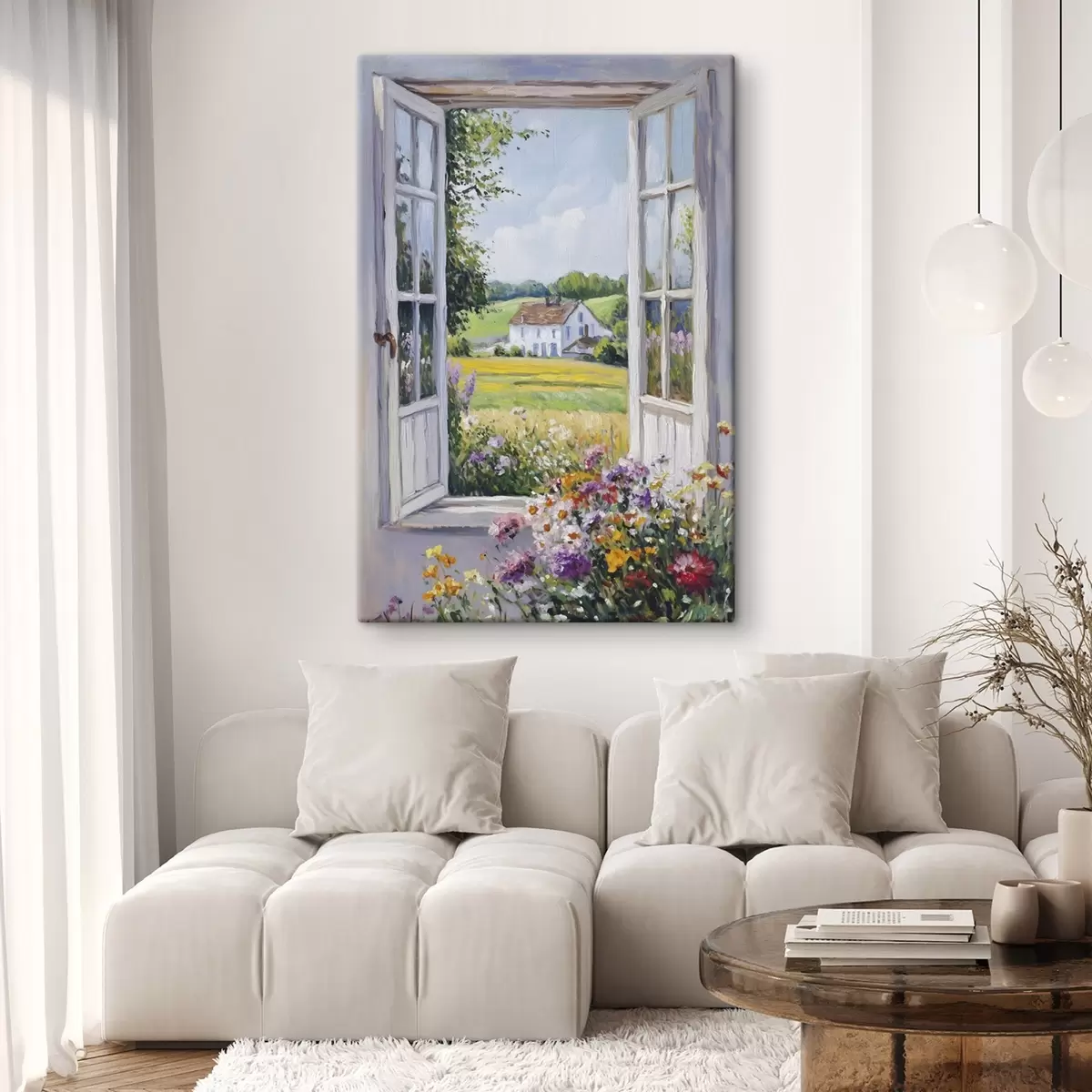 Obraz Dedinská krajina v drevenom okne, kvety, polia, olejový štýl, statok Nr. s43888