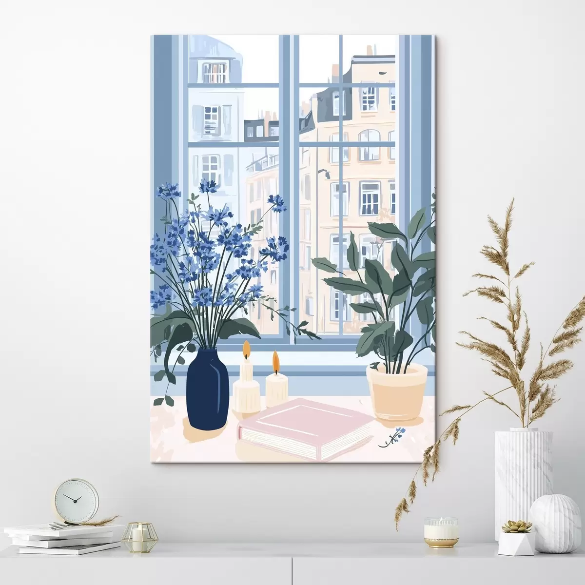 Obraz Útulný dom s kvetmi a výhľadom z okna, architektúra, modré farby Nr. s44010