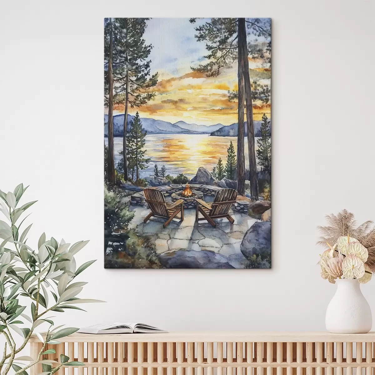 Obraz Jazero s horami pri západe slnka, cestovanie, útulný krb, akvarel Nr. s44018