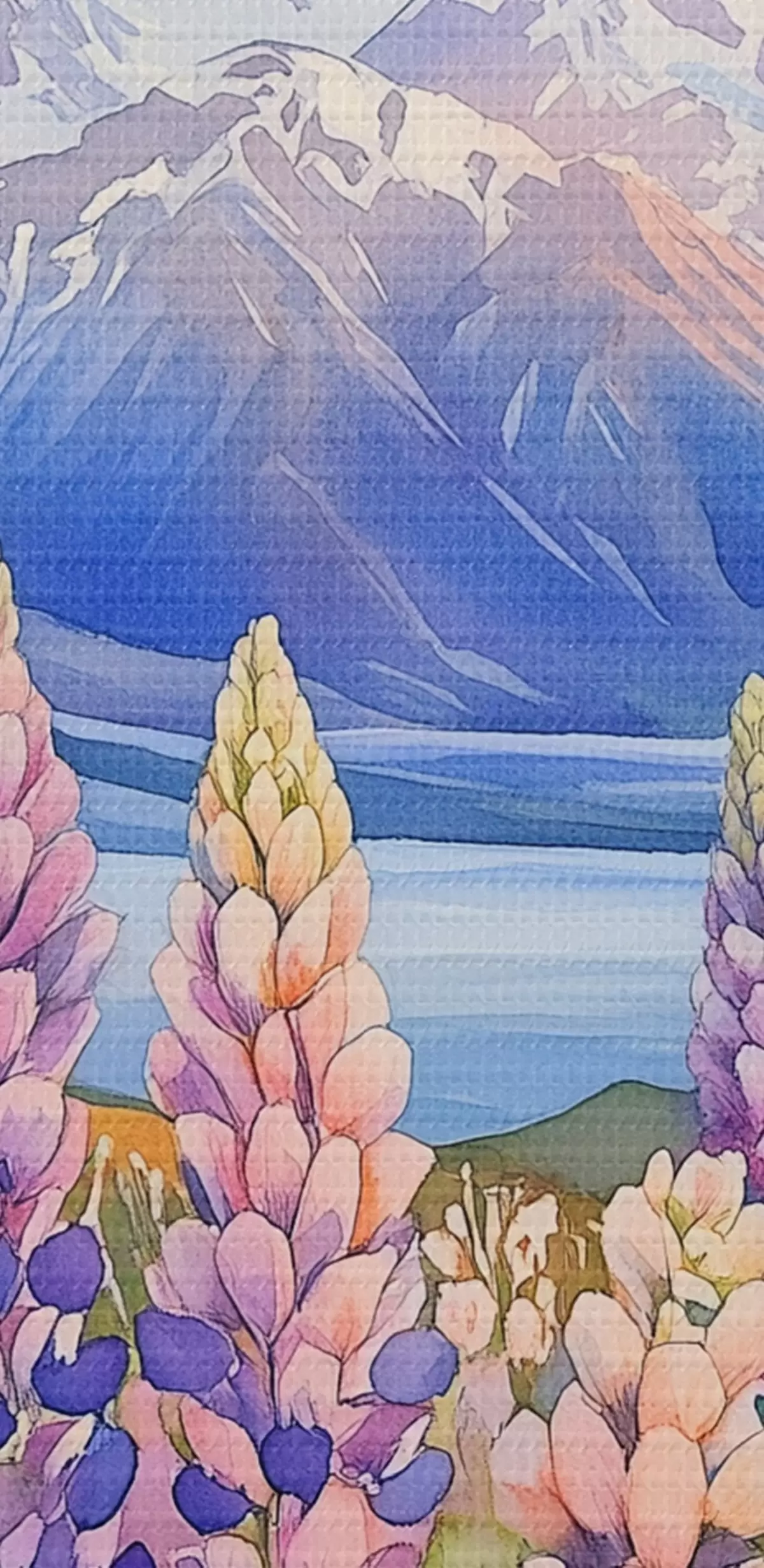 Obraz Lupinové kvety, lúka, hory, akvarel, obloha pri západe slnka Nr. s44146