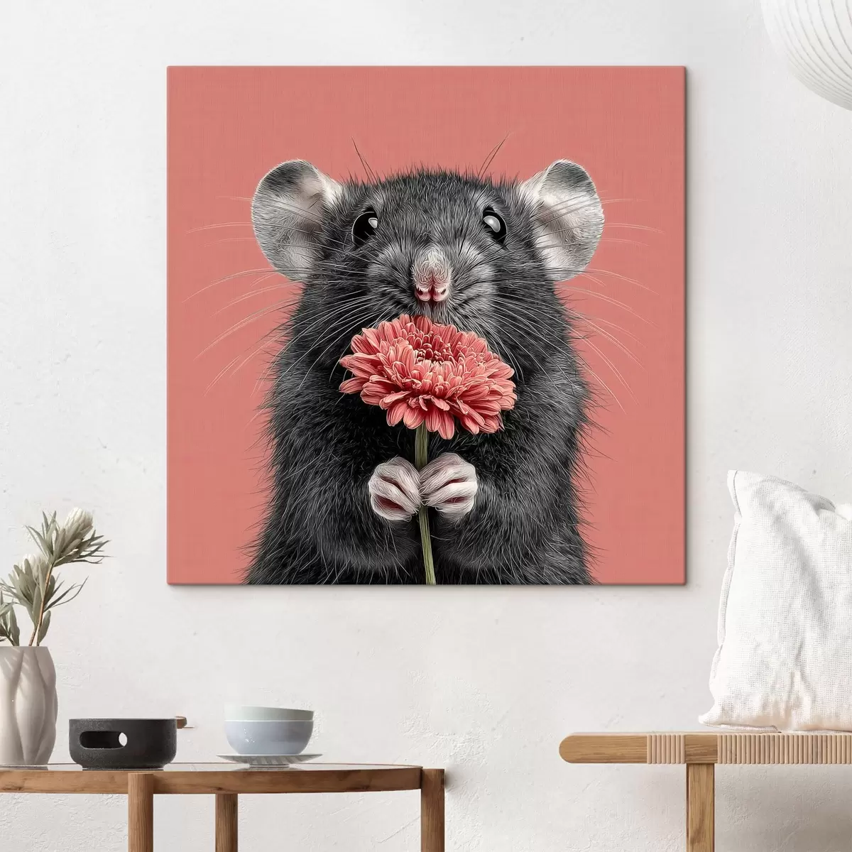 Obraz Zvedavý potkan s ružovou gerberou v minimalistickom štýle Nr. s44241