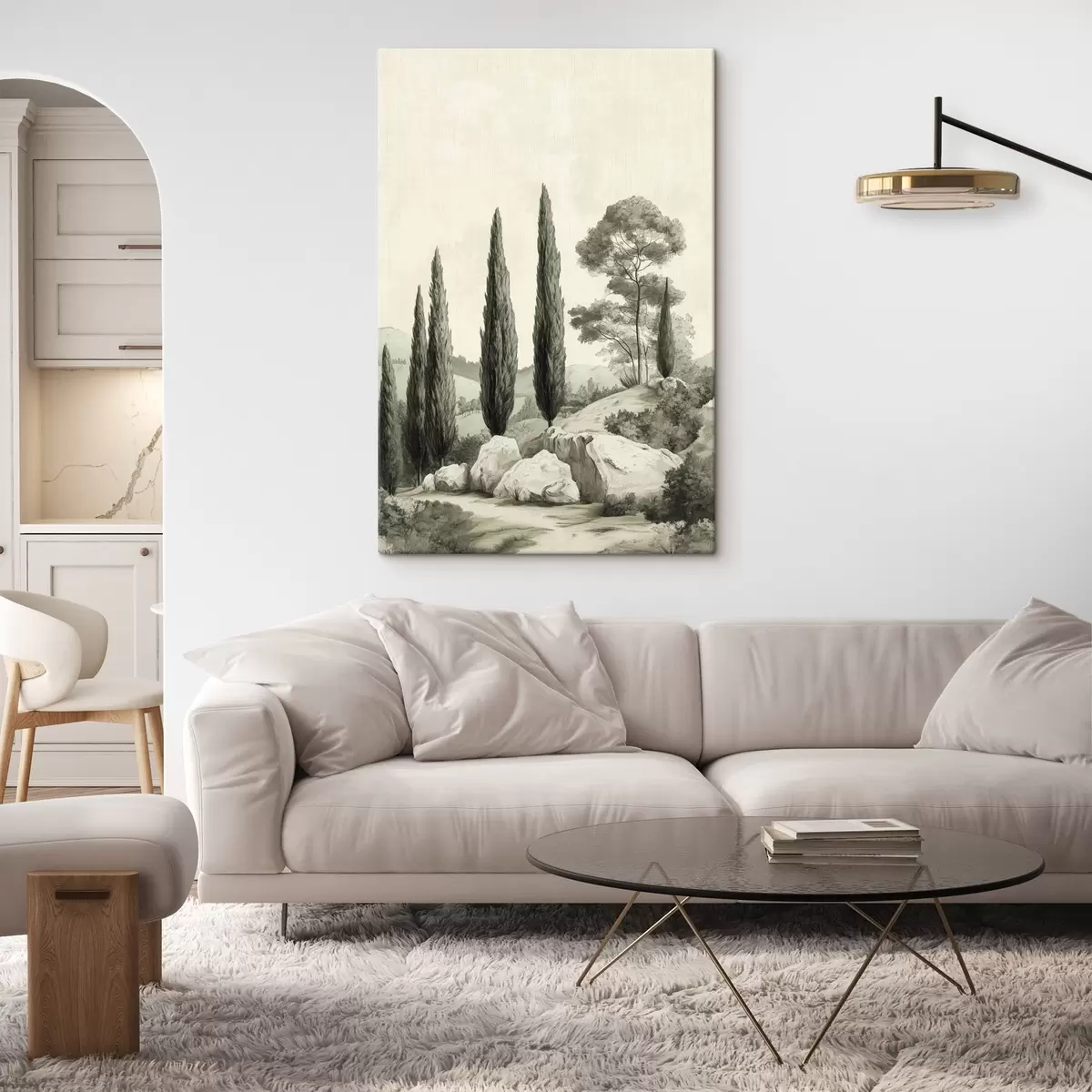 Obraz Toskánska krajiny, pastelové farby, cyprusy, skaly, rustikálny štýl Nr. s44307
