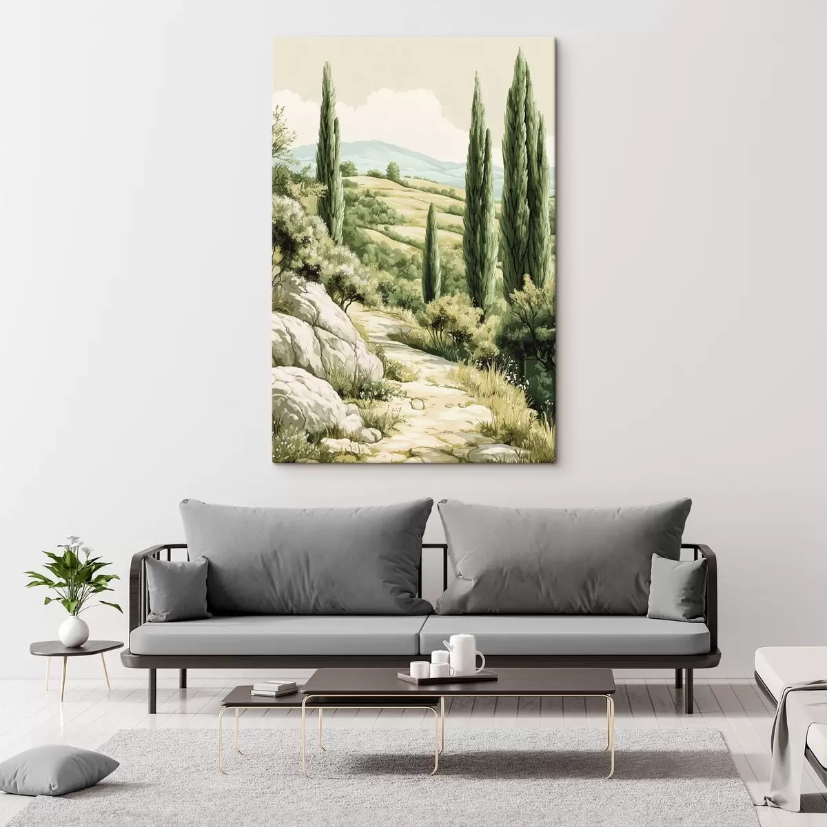 Obraz Letná krajina s cyprusmi a zelenými kopcami, rustikálny štýl Nr. s44308