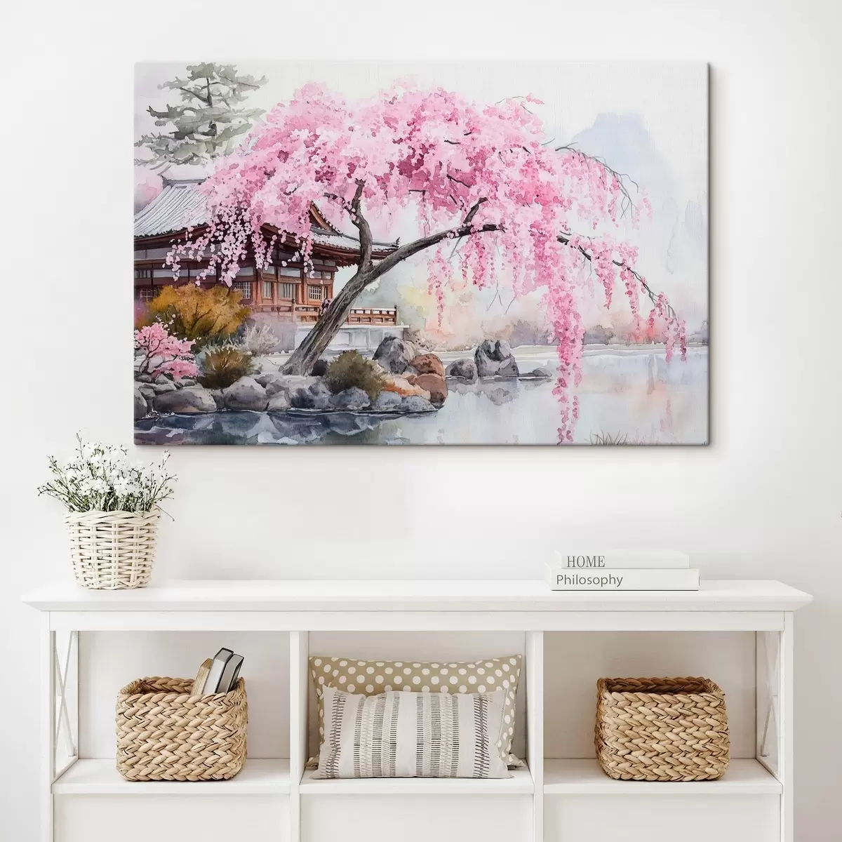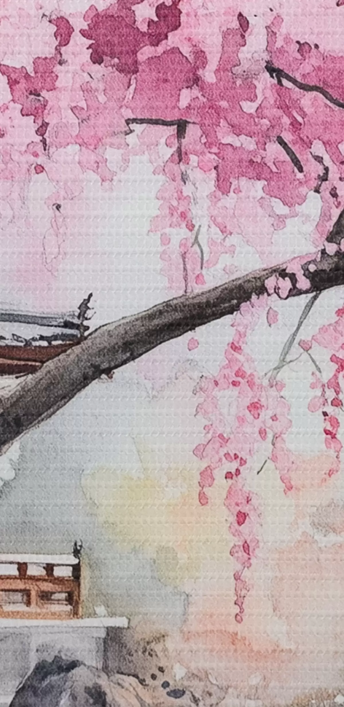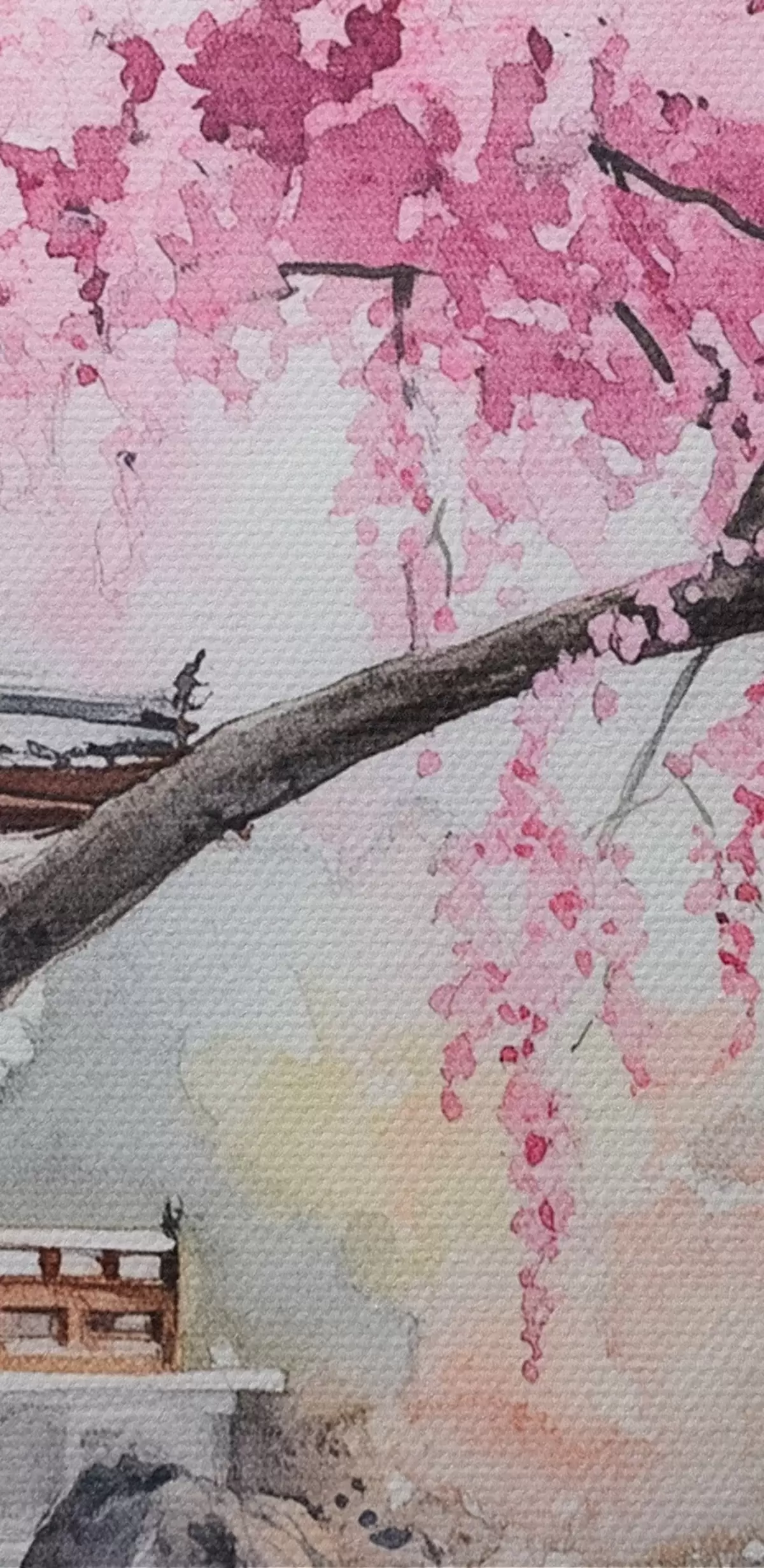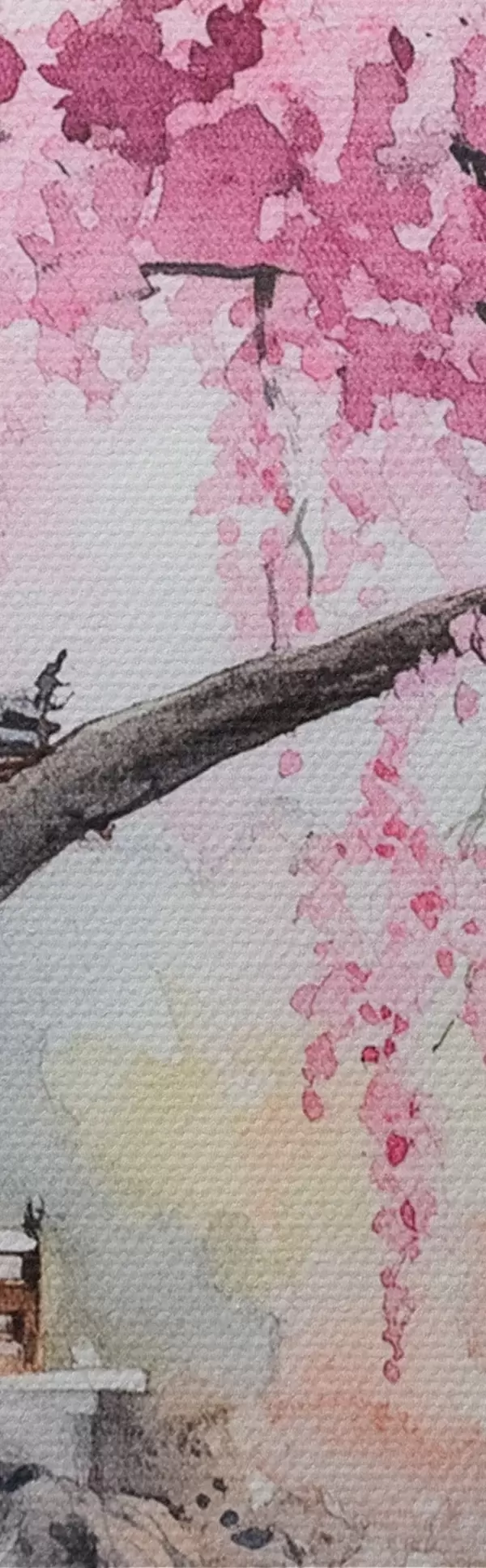 Obraz Ružový čerešňový strom pri dome na jazere, Japonsko, orientálny, akvarel Nr. s44312