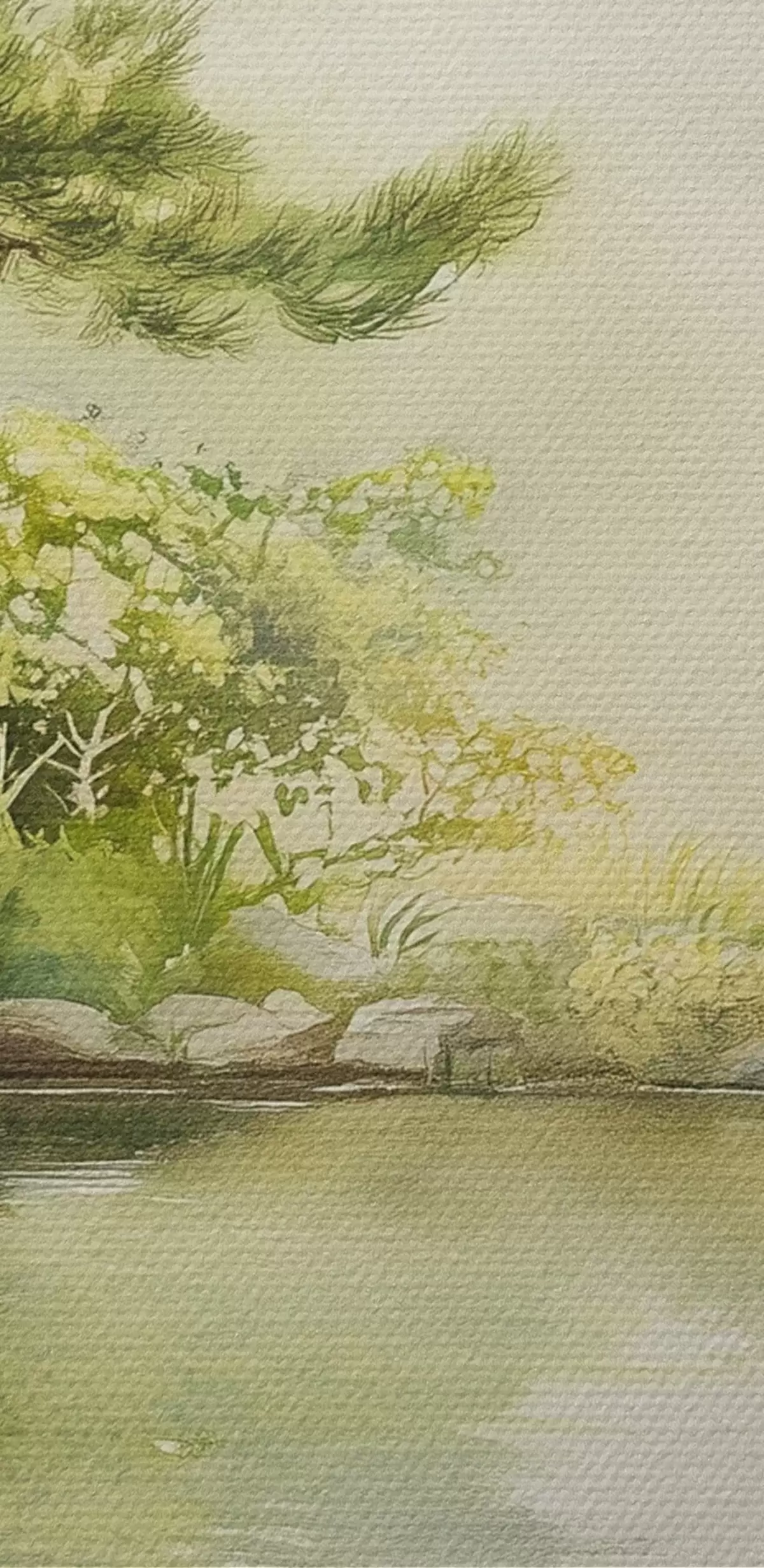 Obraz Orientálna záhrada s jazerom a stromami, príroda, akvarel Nr. s44313