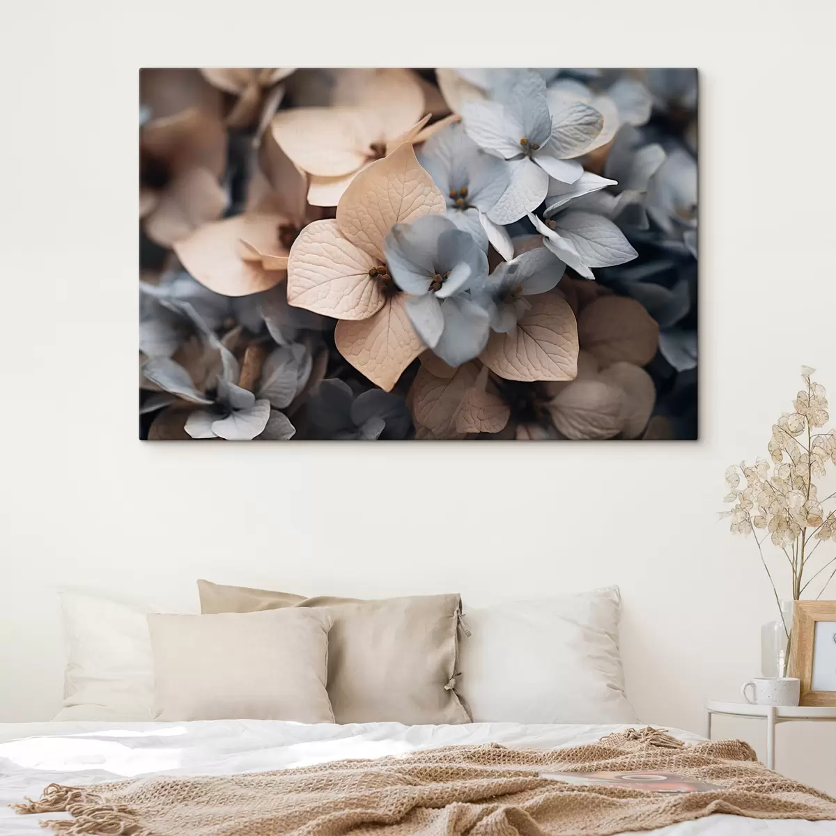 Obraz Kvety hortenzie, svetlomodré a béžové okvetné lístky, s detailnými textúrami, elegantné kvetinové aranžmá Nr. s44394