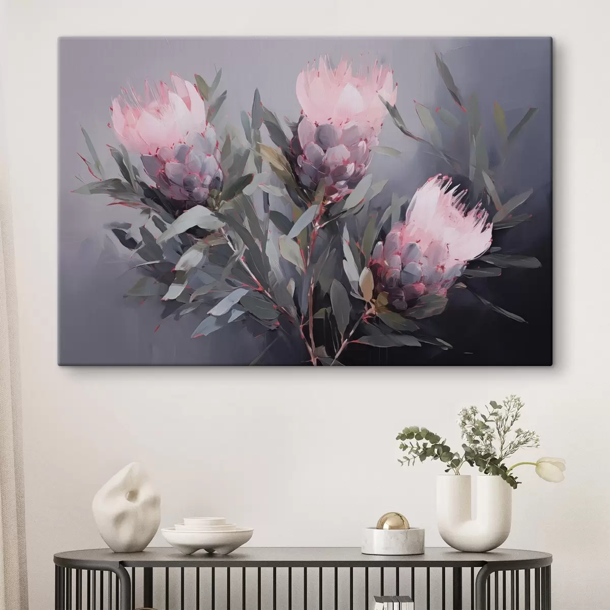 Obraz Ružové kvety protey so zelenými listami, jemné ťahy štetcom, tmavé farby, elegantné zloženie Nr. s44400