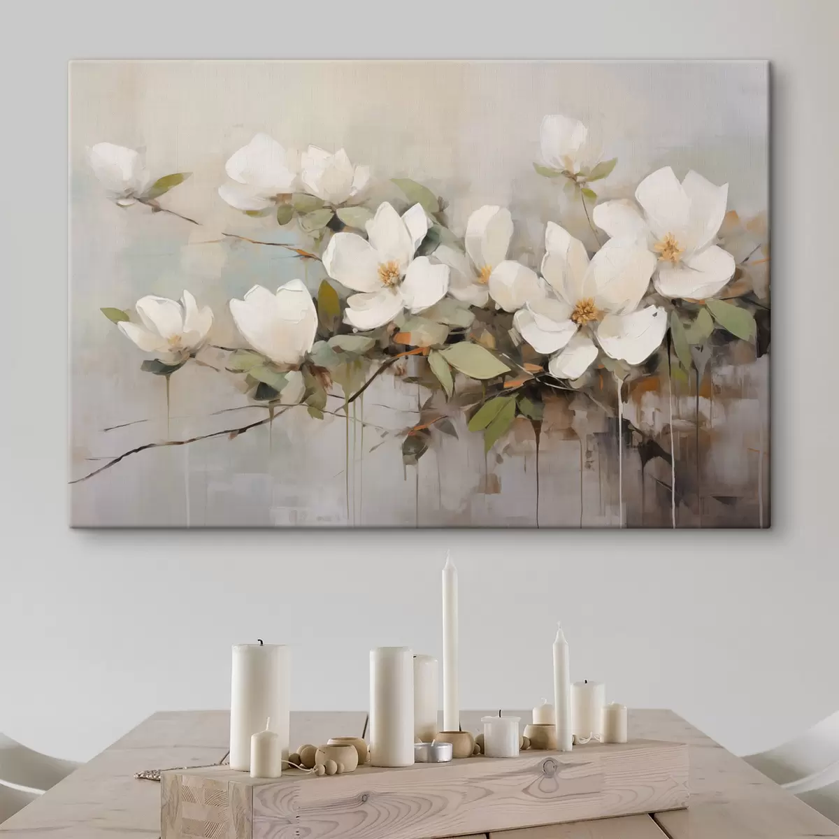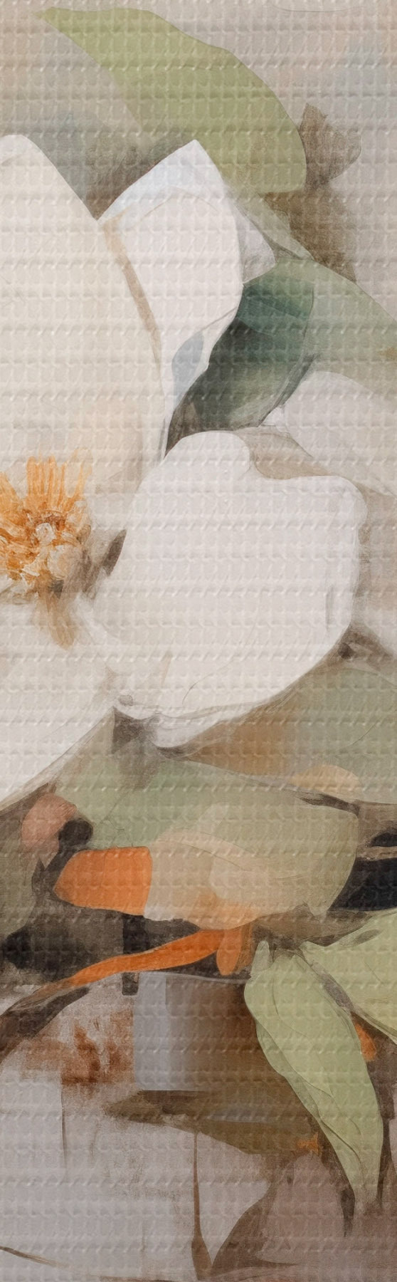 Obraz Biele kvety magnólie so zelenými listami na vetve, jemné ťahy štetcom, tlmené farby Nr. s44404