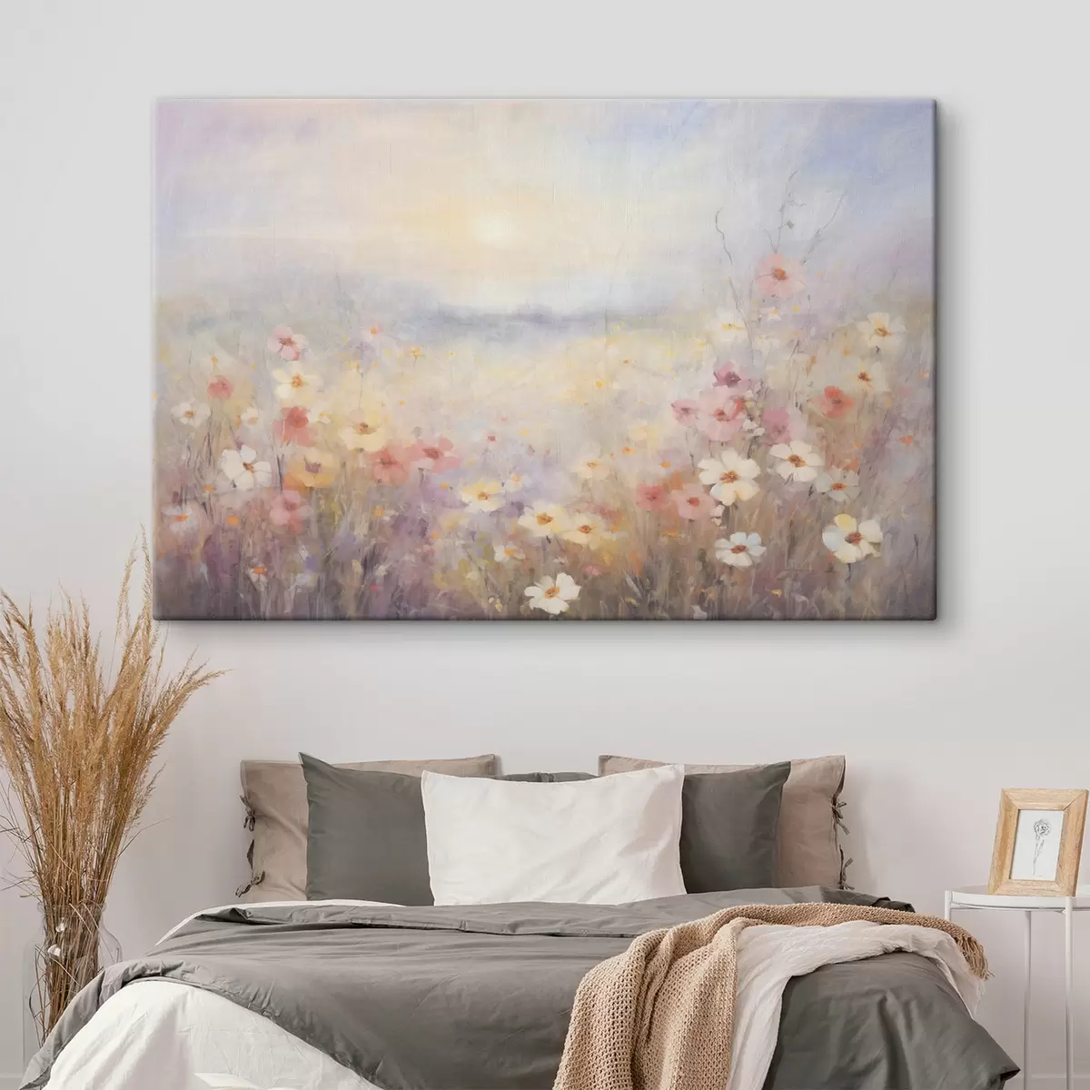 Obraz Textúrovaná slnečná krajina kvetinového poľa, jemné pastelové farby, zasnená atmosféra Nr. s44408