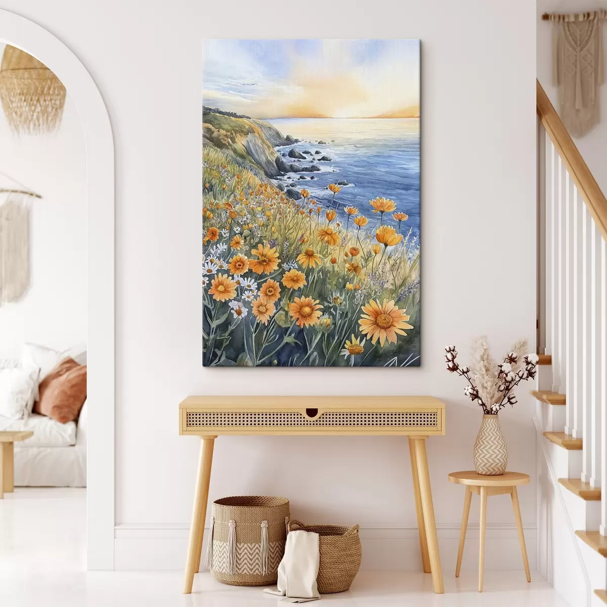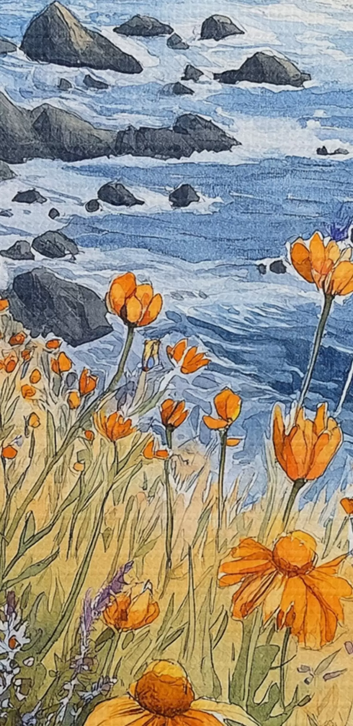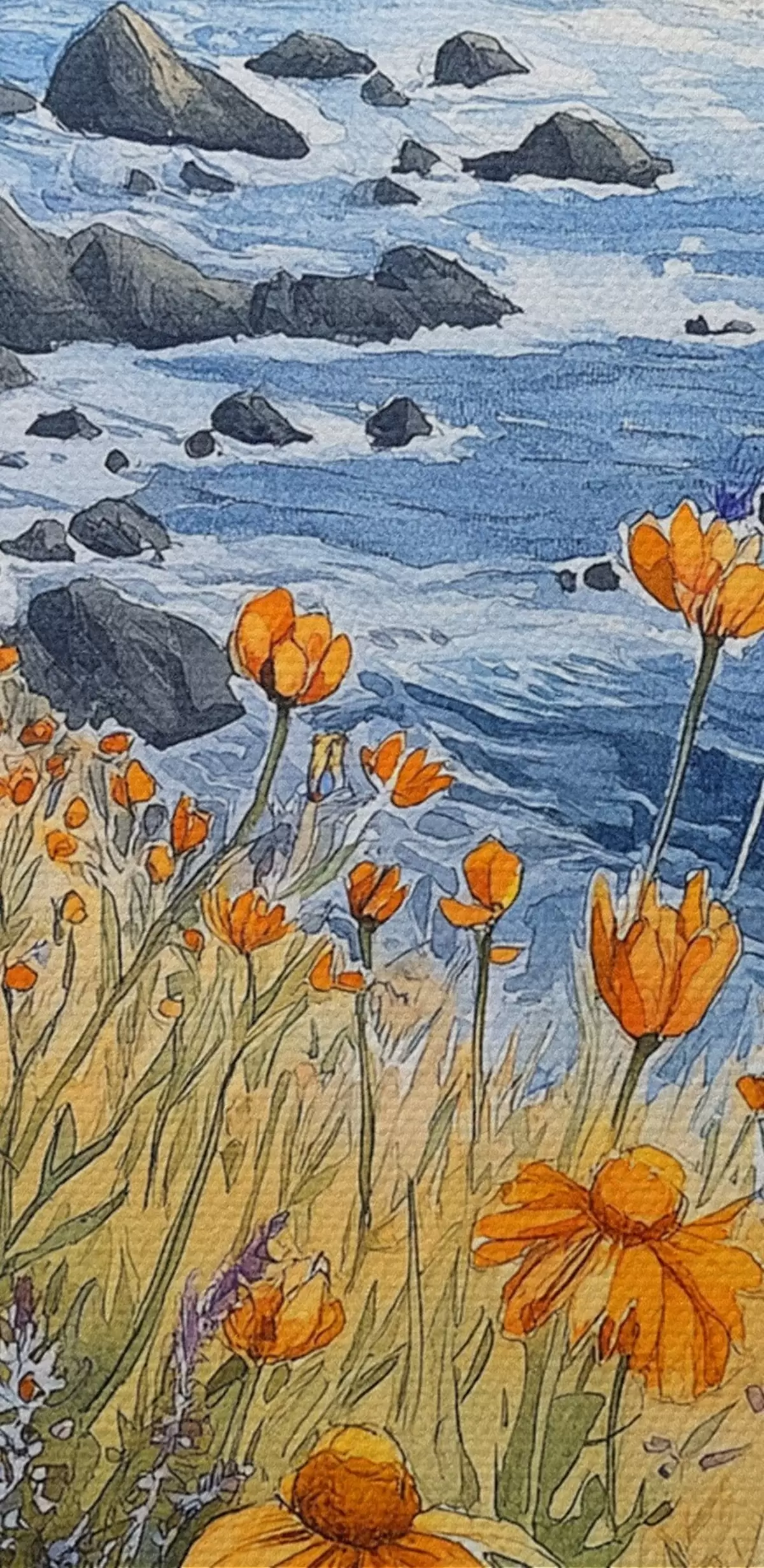 Obraz Útes s oranžovými kvetmi, pobrežie oceánu, Portugalsko, akvarel Nr. s44604