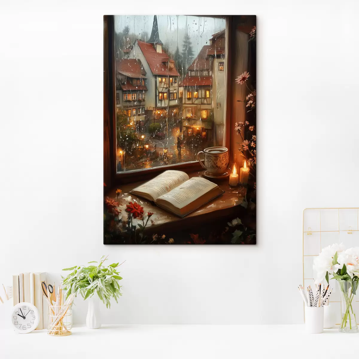 Obraz Kniha na parapete, sviečky, daždivý deň, útulný Nr. s44722