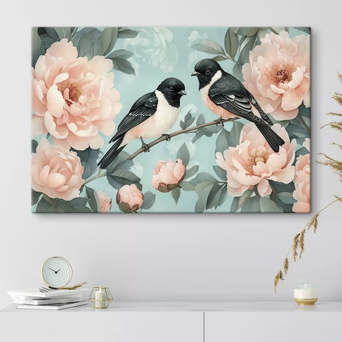 Obraz Dvaja vtáci na konári s pivonkami Nr. s44786