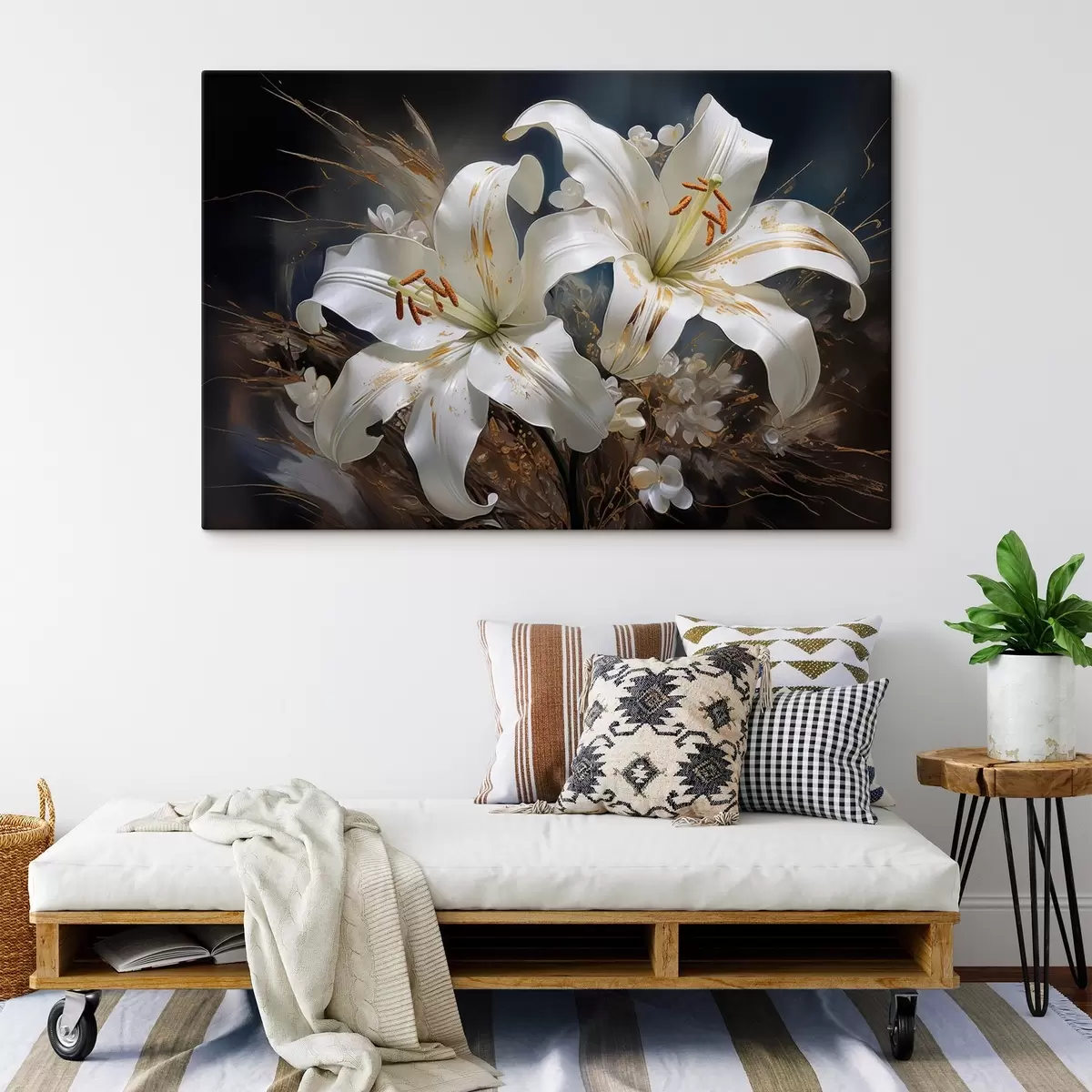 Obraz Kvety ľalií na tmavom pozadí s dekoratívnymi prvkami Nr. s44848