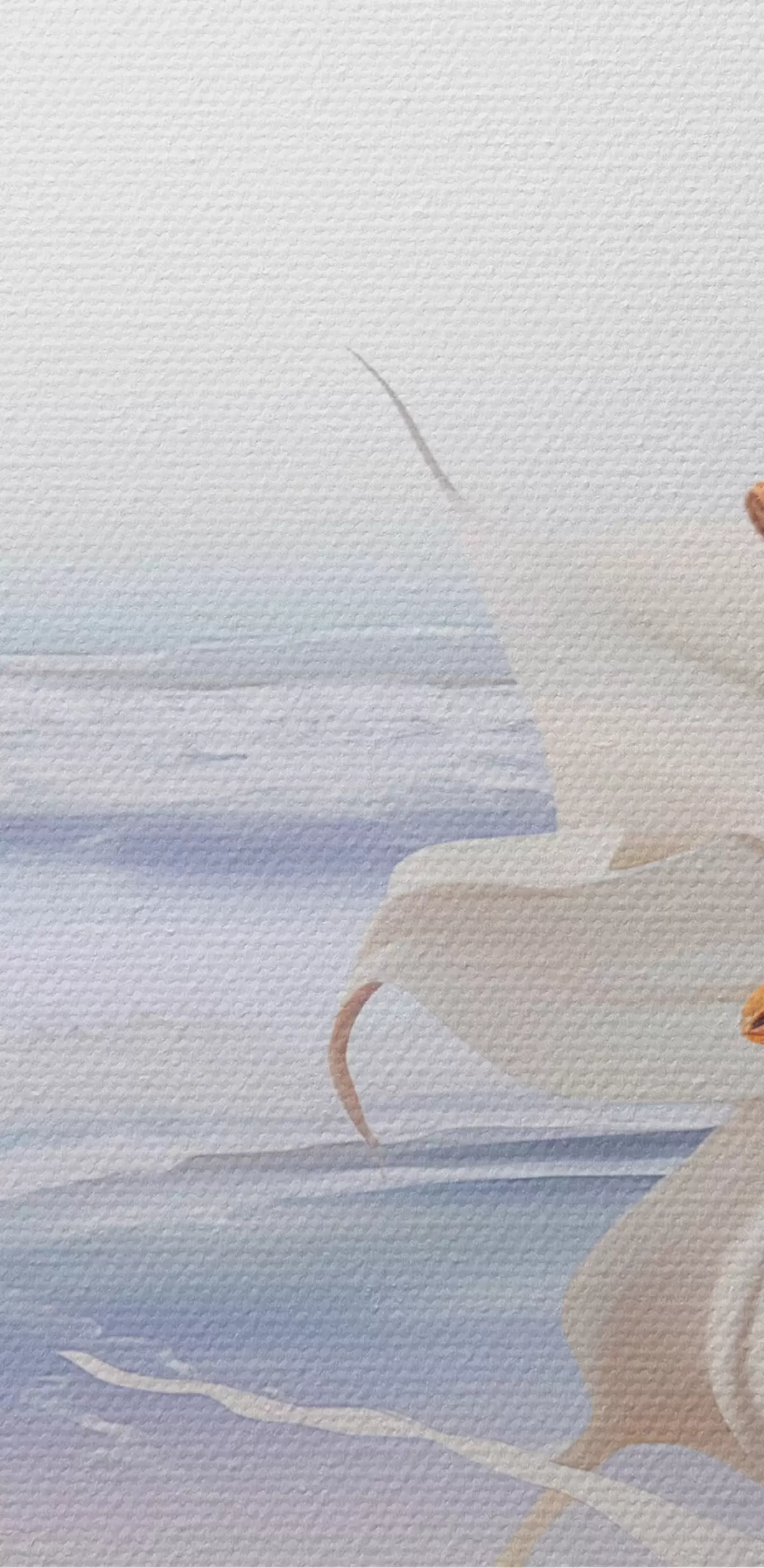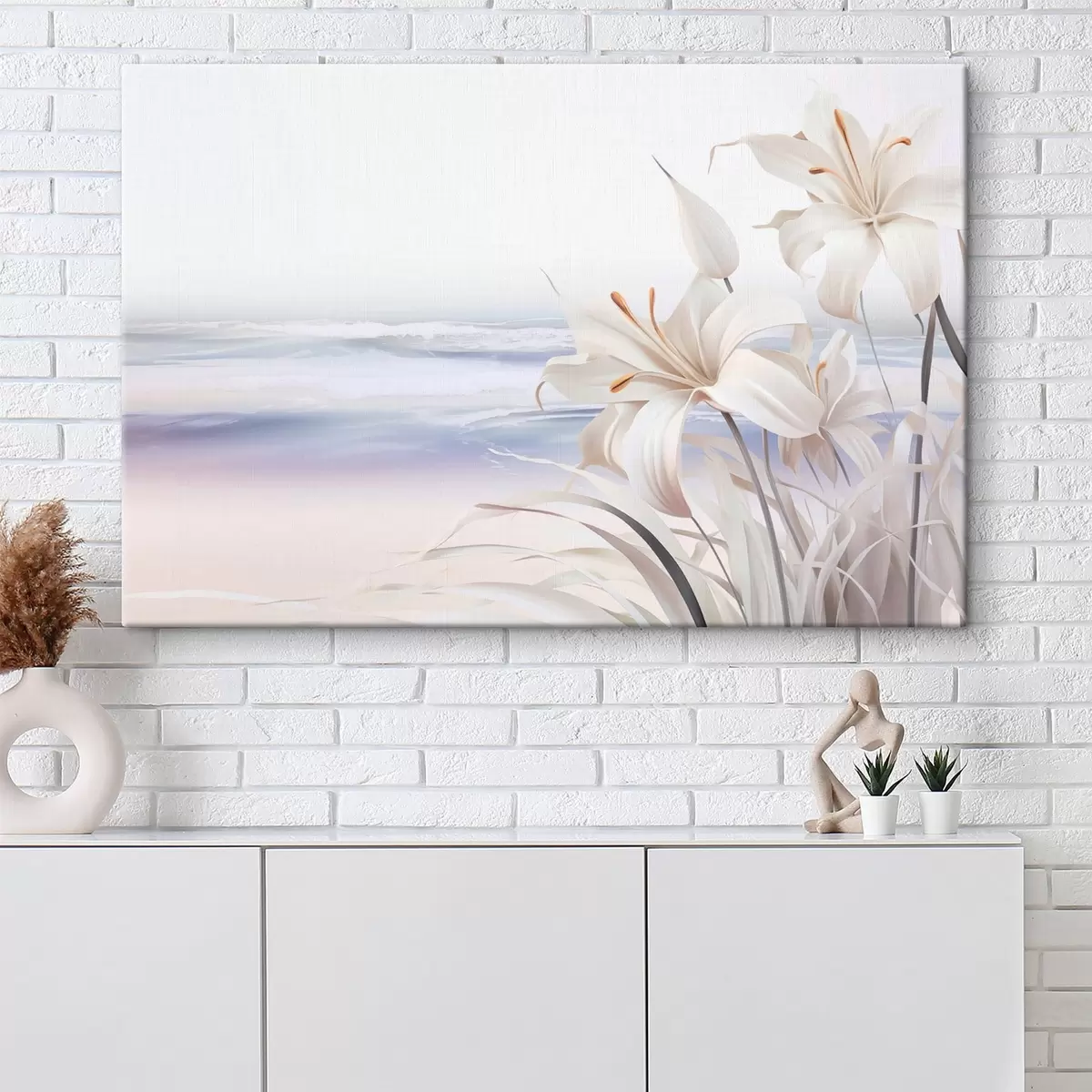 Obraz Biele ľalie s oranžovými piestikmi a dlhými listami na pláži s jemnými vlnami v pozadí, pastelové farby Nr. s44850
