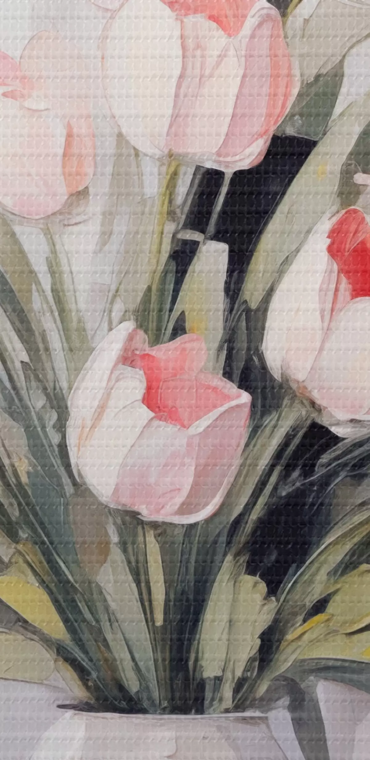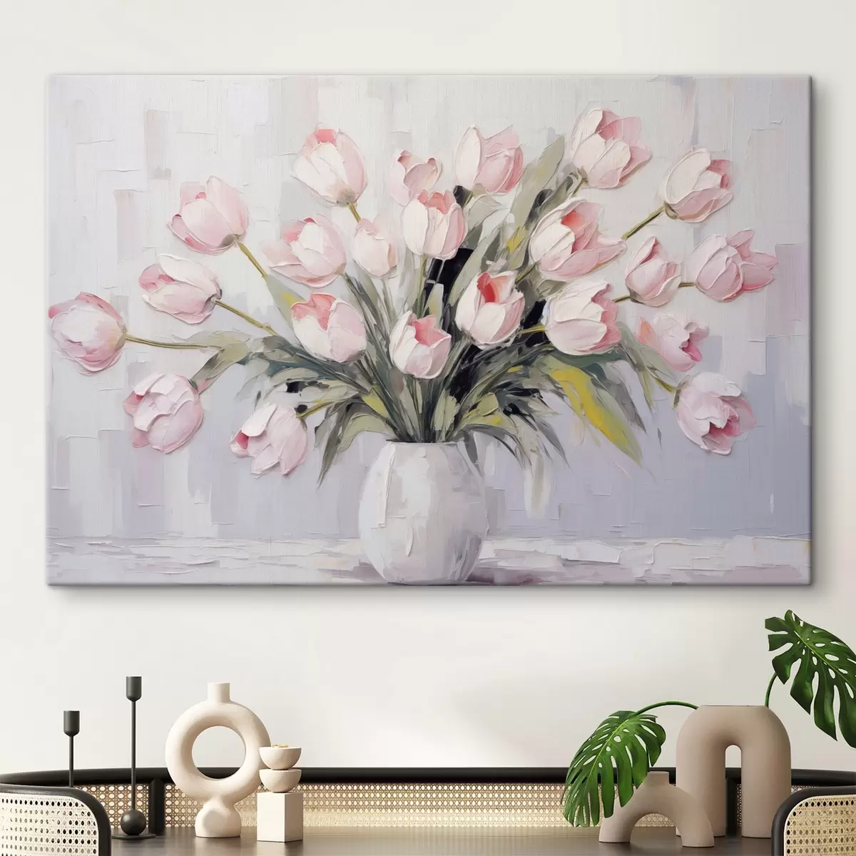 Obraz Váza s ružovými tulipánmi, zelené listy, svetlosivé pozadie , štýl olejomaľby, husté ťahy štetcom Nr. s44852