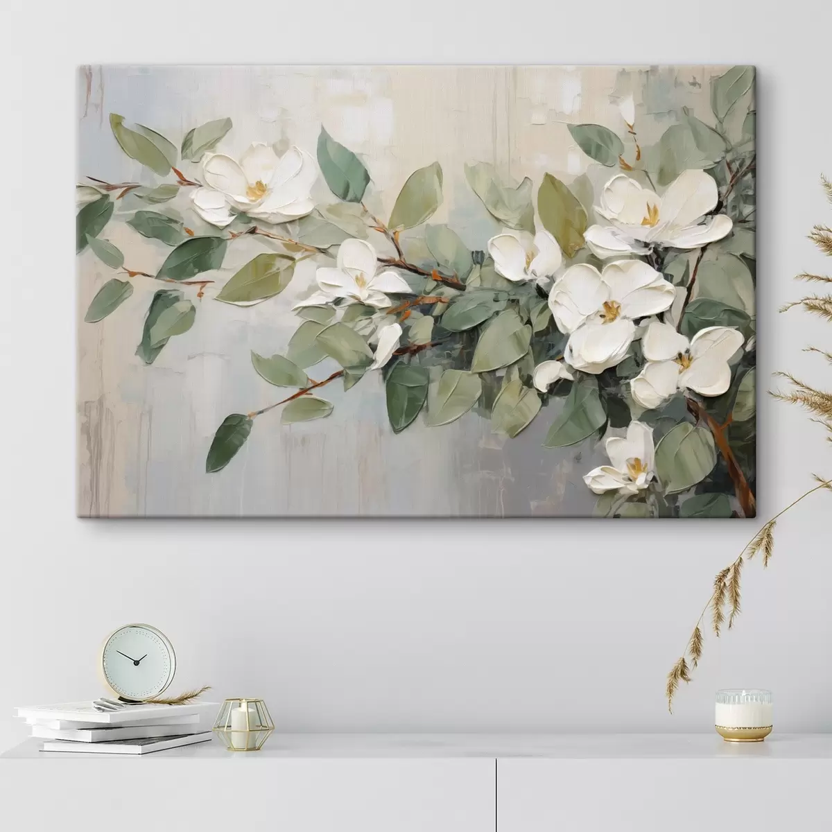 Obraz Kvety magnólie so zelenými listami na vetve, impasto textúrovaný štýl, jemná paleta farieb Nr. s44853