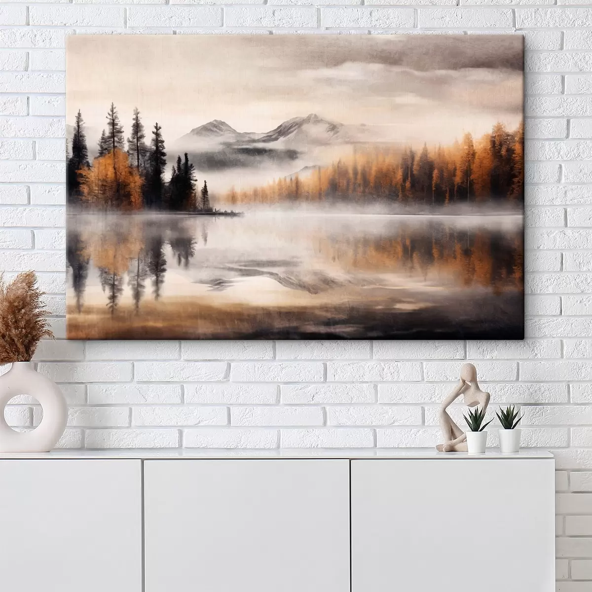 Obraz Hmlistá krajina s jazerom, borovicami a horami, zamračená sivá obloha Nr. s44856