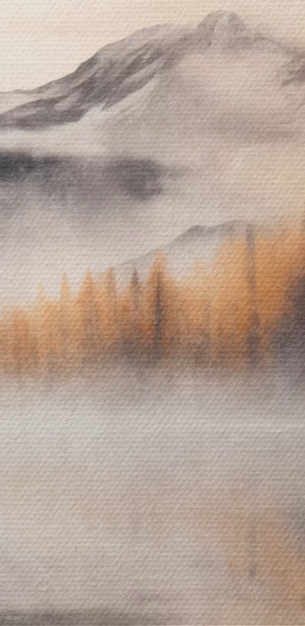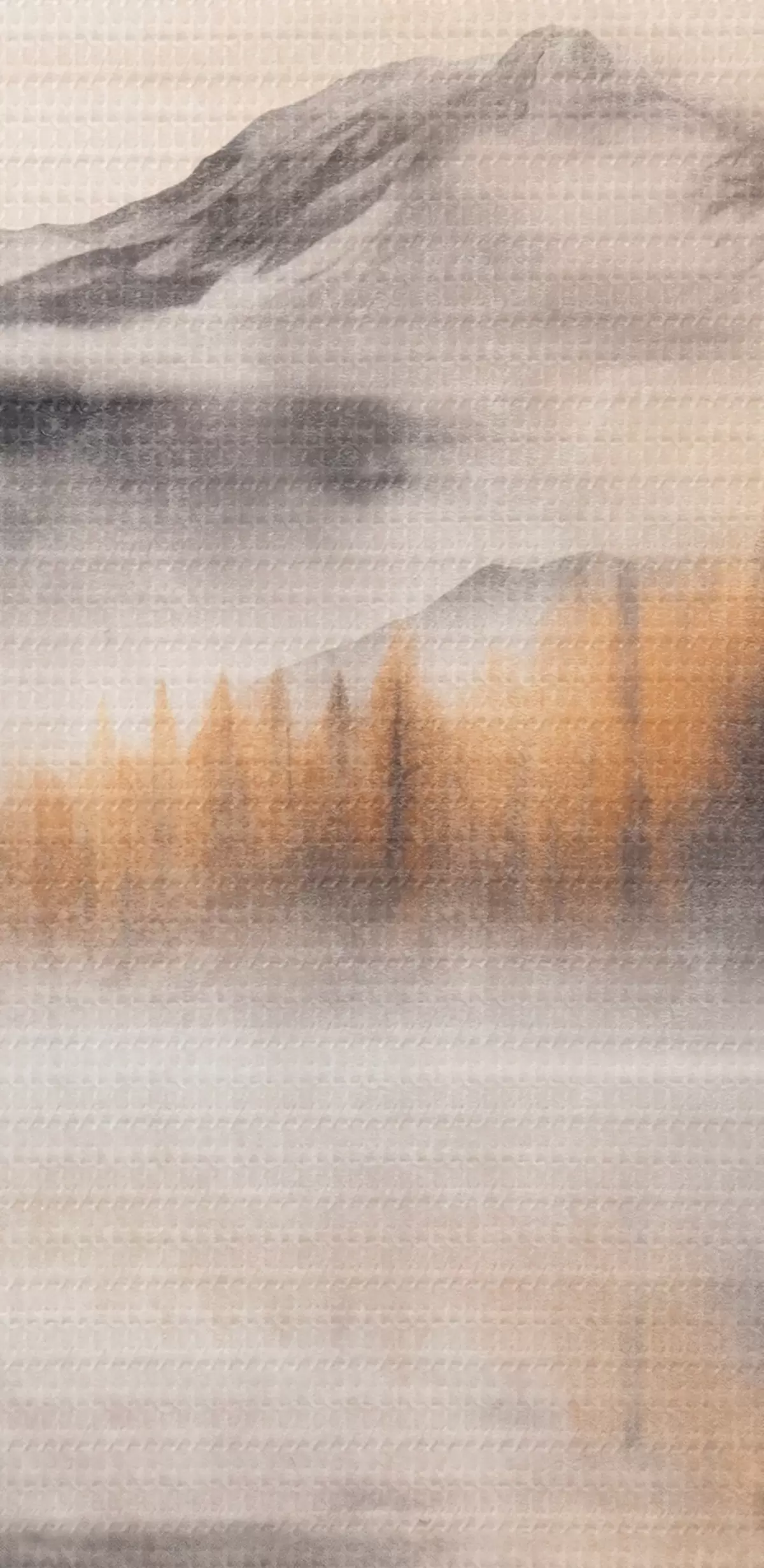 Obraz Hmlistá krajina s jazerom, borovicami a horami, zamračená sivá obloha Nr. s44856