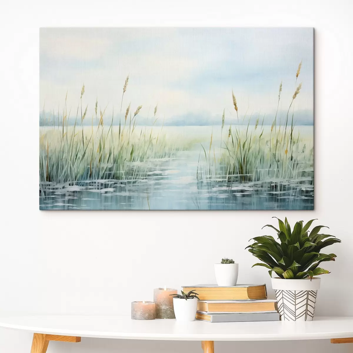 Obraz Akvarelová maľba imitujúca vysokú trávu rastúcu pri vode , zamračená obloha a rozmazané pozadie Nr. s44860