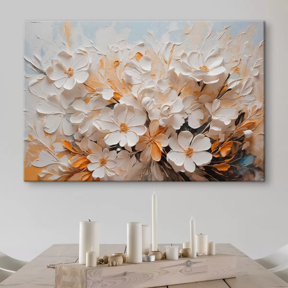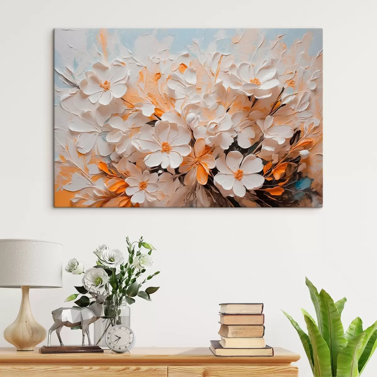 Obraz Biele a broskyňové kvety na modrom pozadí s pastelovými farbami Nr. s44879