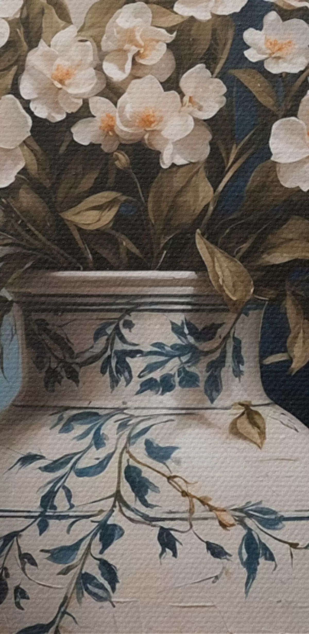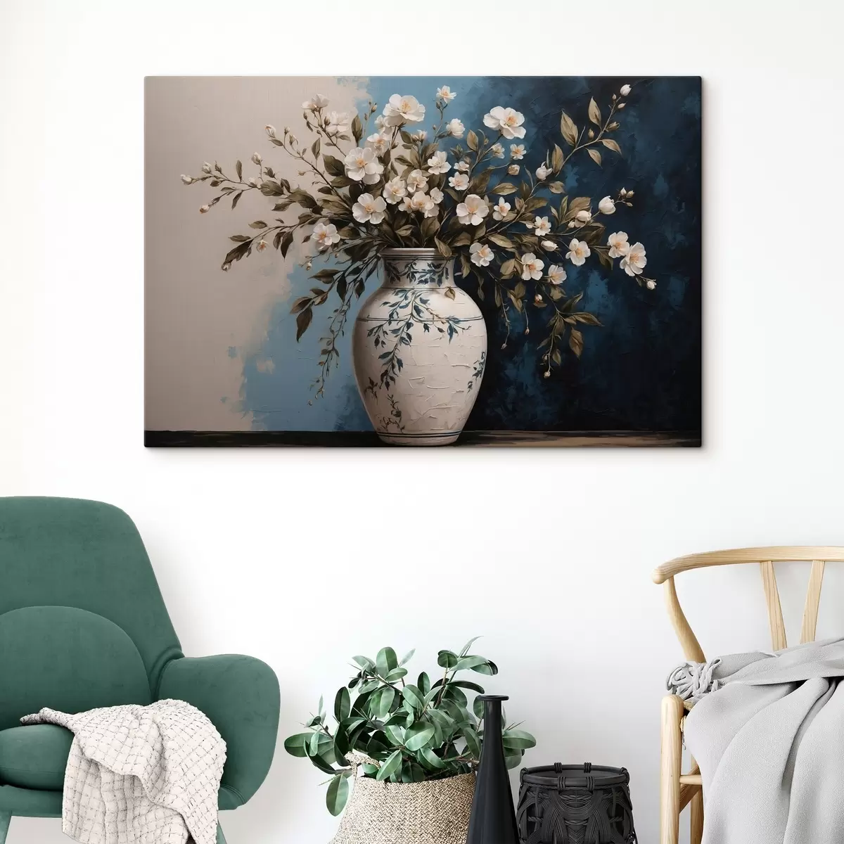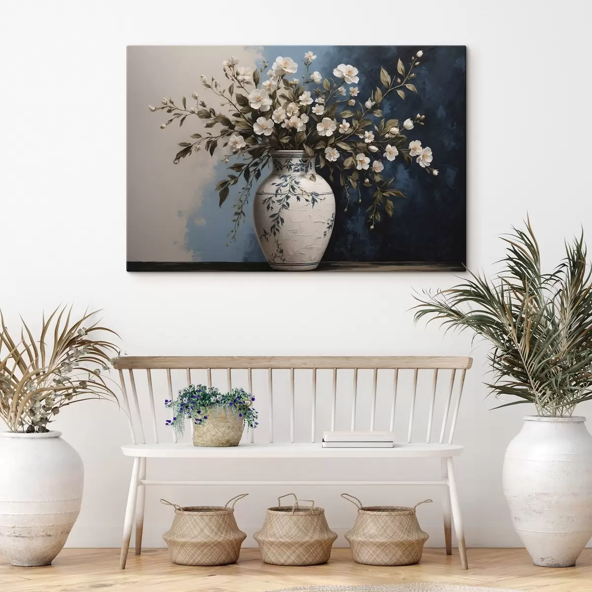 Obraz Biele a žlté kvety vo veľkej váze na modrom pozadí Nr. s44893