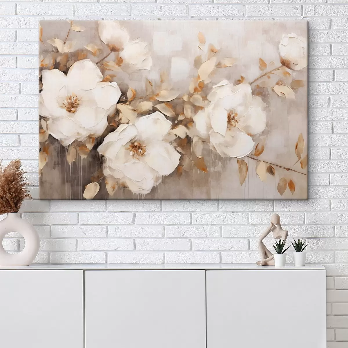 Obraz Biele kvety s hnedými listami na béžovom pozadí, imitácia olejomaľby, kvetinové aranžmá, botanické umenie Nr. s44922