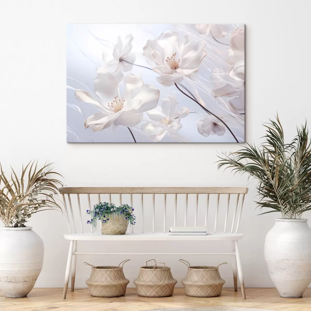 Obraz Biele kvety s priesvitnými okvetnými lístkami, jemné svetlomodré pozadie, elegantné, romantické, jemné, zasnené Nr. s44931