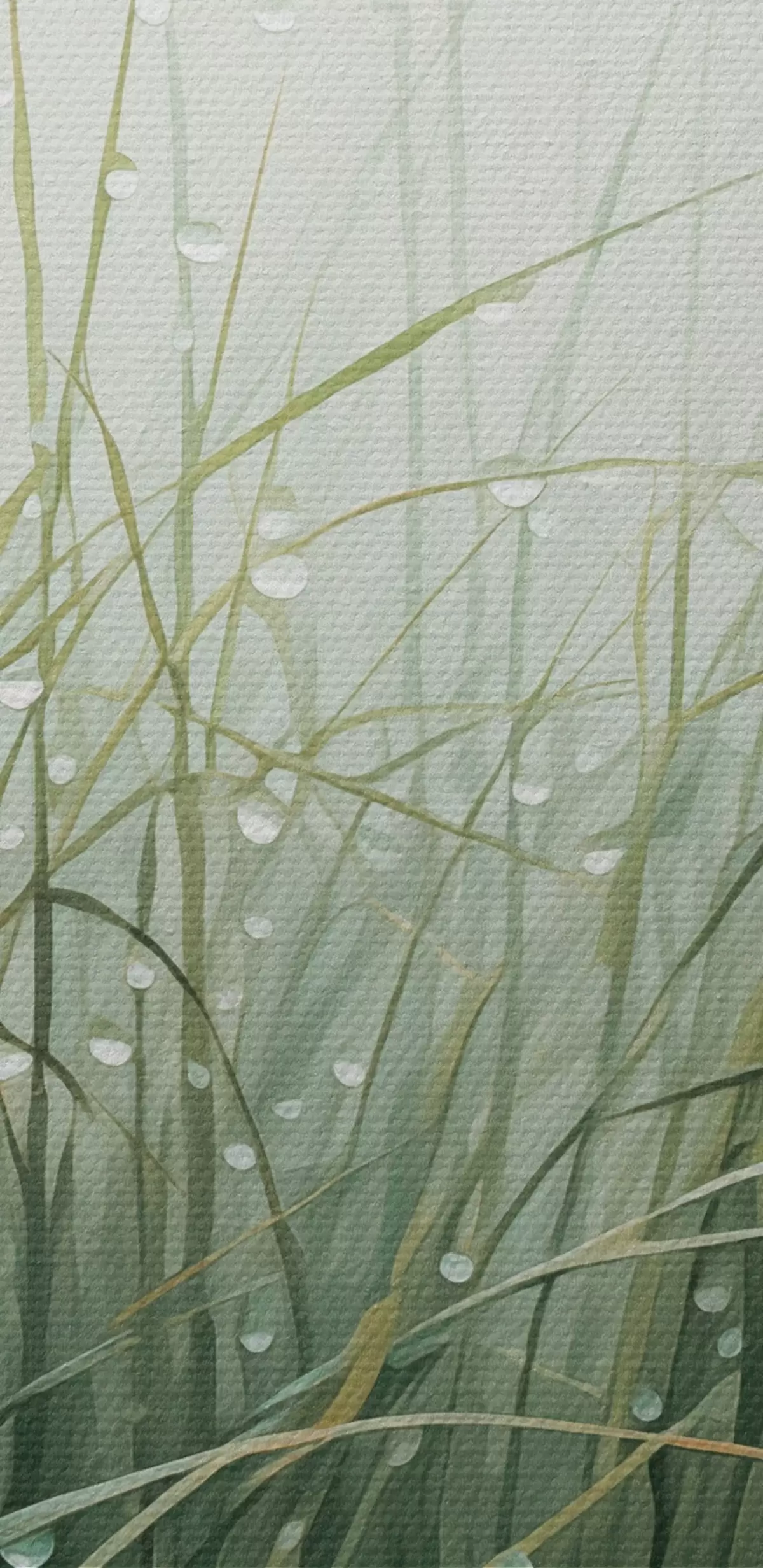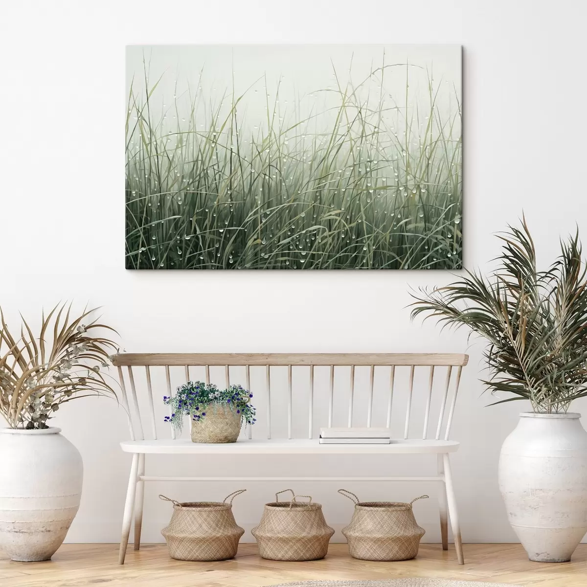 Obraz Tráva s kvapkami vody, zelené odtiene, mäkké svetlo, hmlisté pozadie, abstraktný minimalistický textúrovaný štýl Nr. s44932