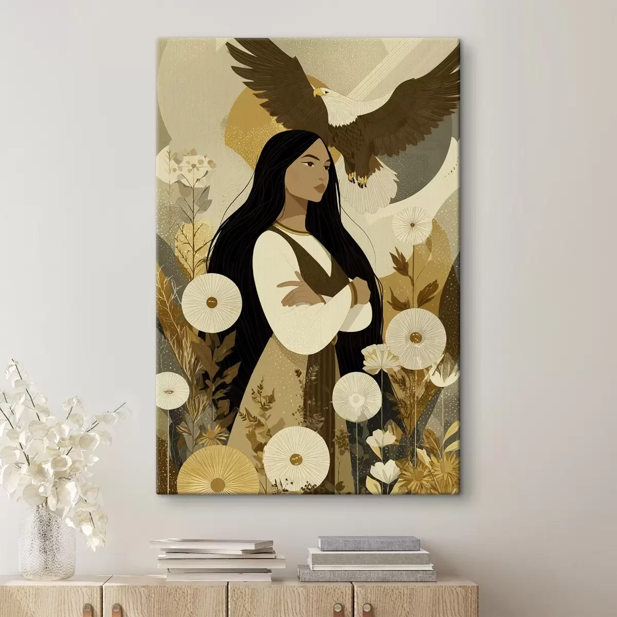 Obraz Žena s lietajúcim orlom, kmeňový štýl, béžové farby Nr. s44977