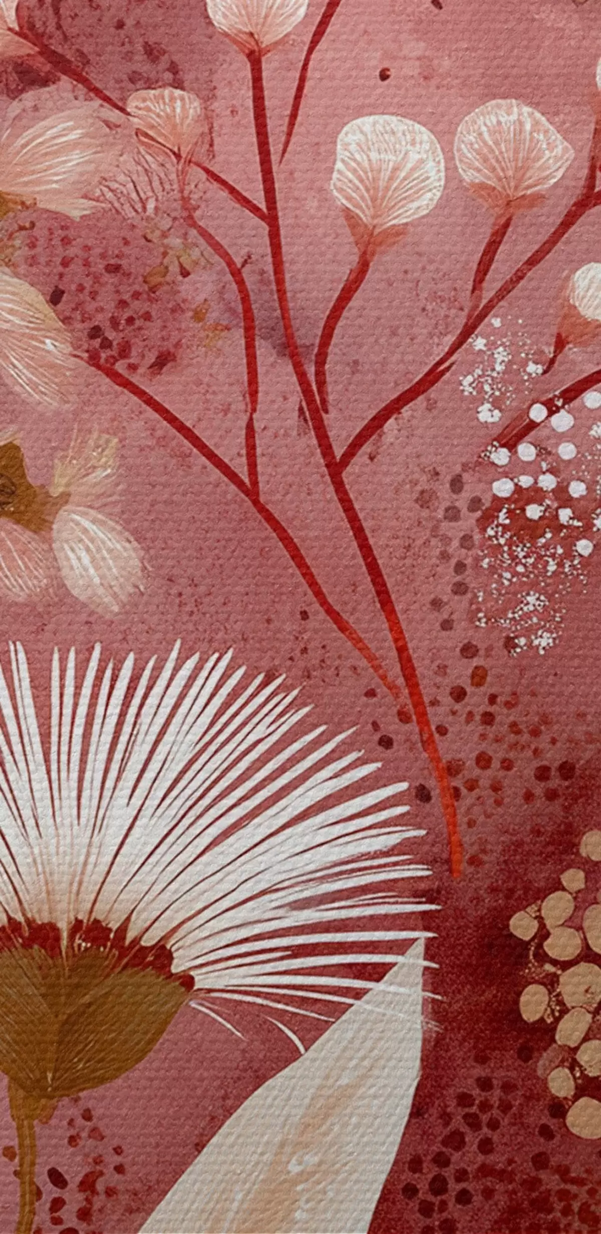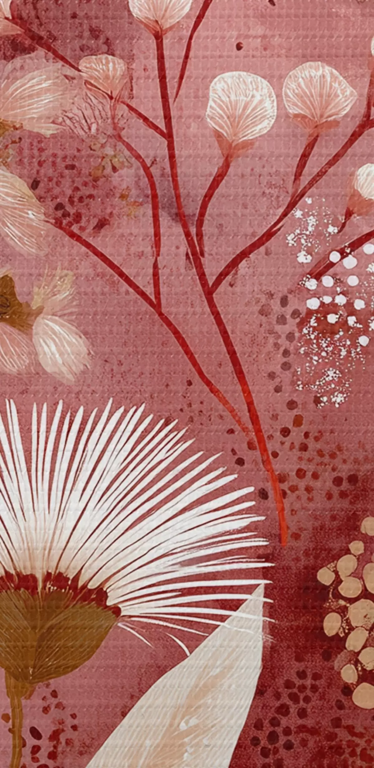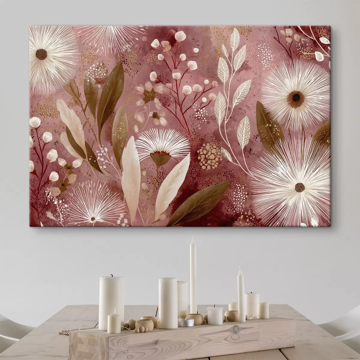 Obraz Biele kvety v boho štýle na červenom pozadí, detailná kresba Nr. s44979