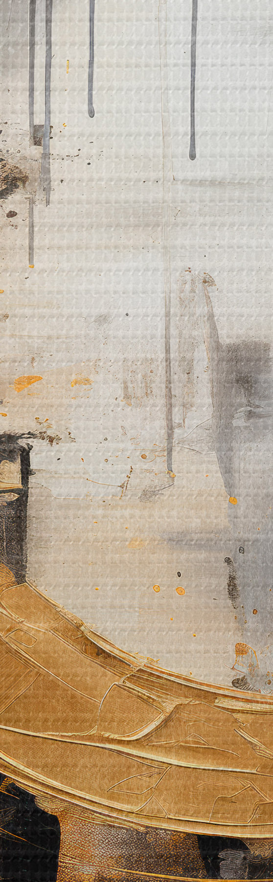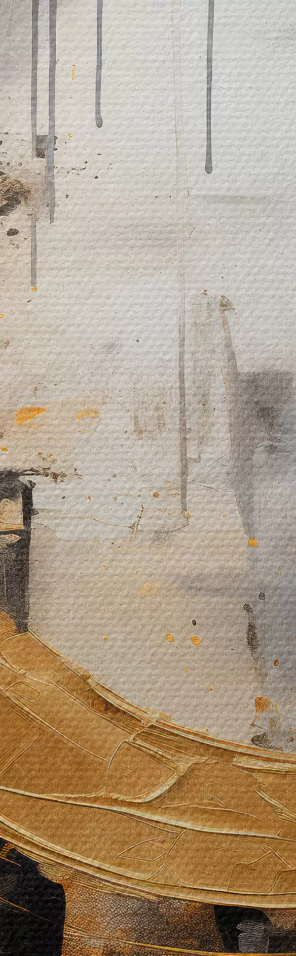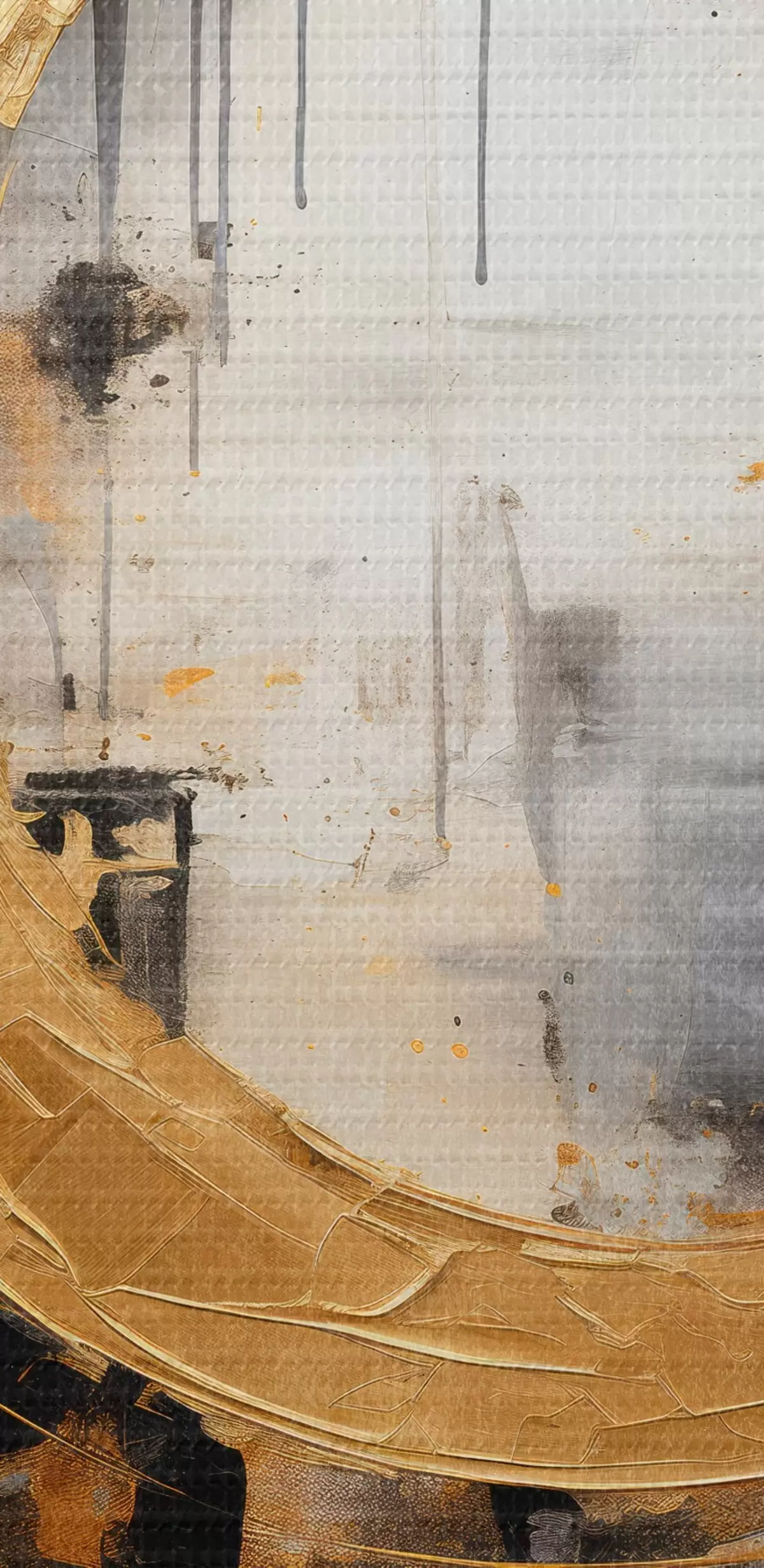 Obraz Abstraktná maľba s kruhmi, čiernymi a žltými čiarami a pozadím so sivými a bielymi tónmi Nr. s45186