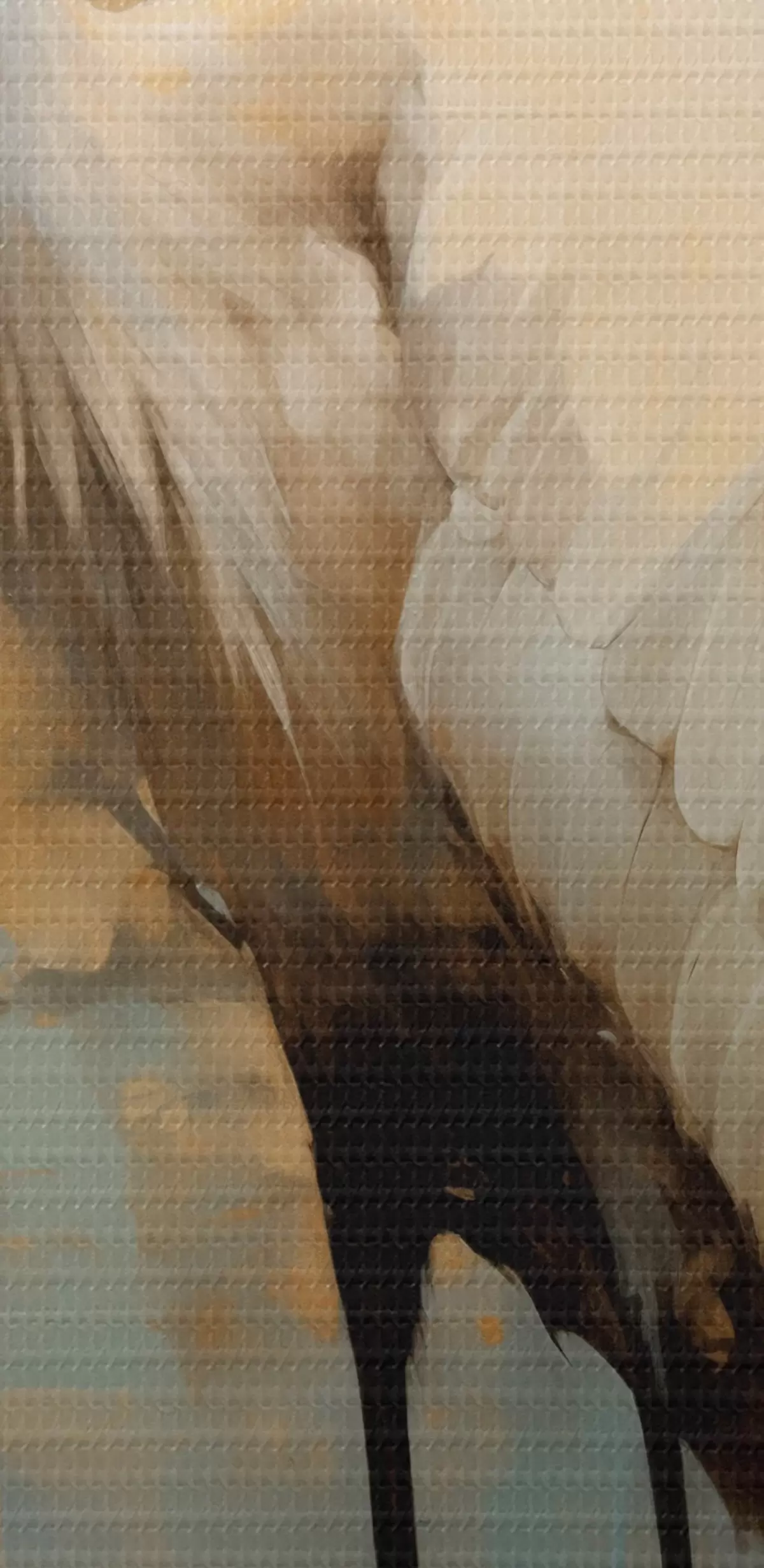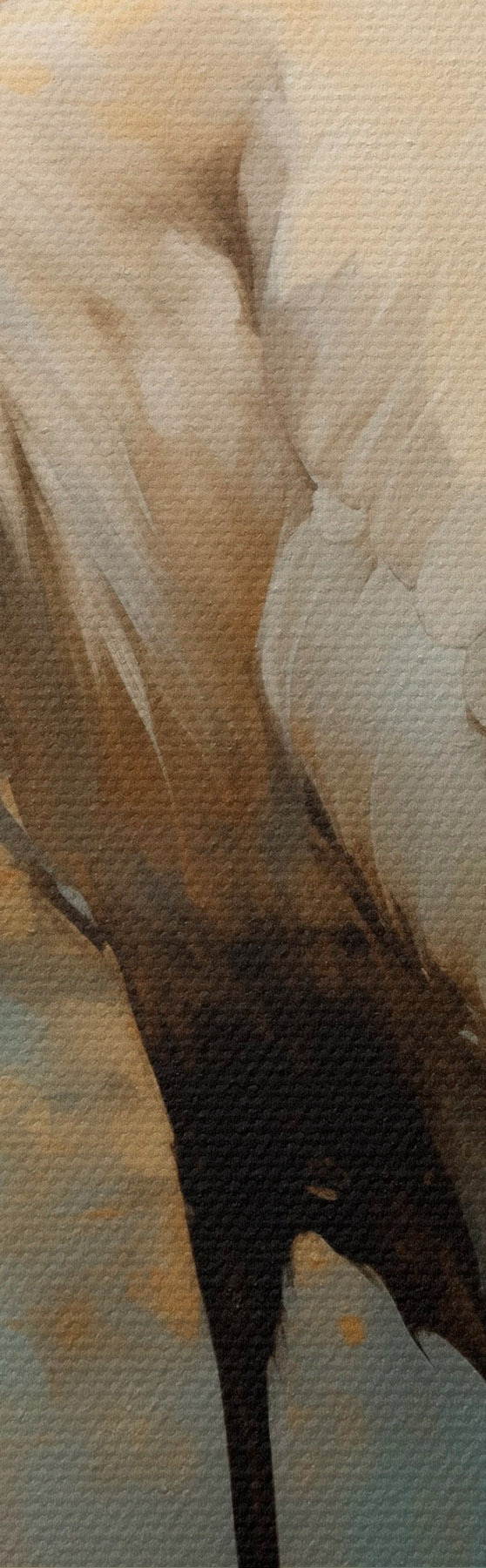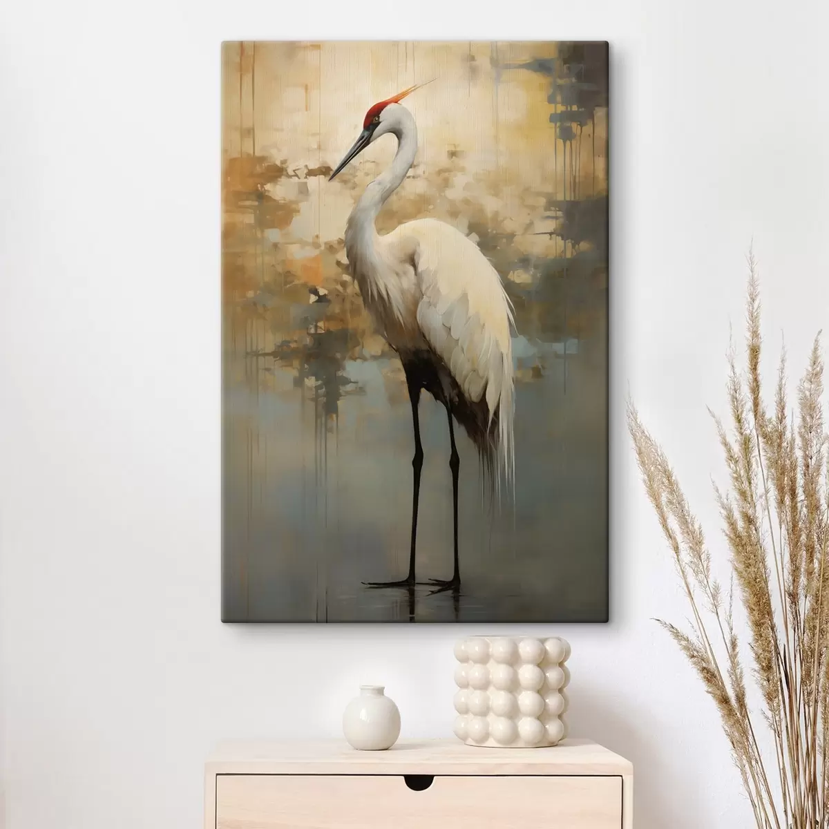 Obraz Biela volavka na pozadí tlmených žltých, hnedých a modrých odtieňov naznačujúcich hmlistú abstraktnú krajinu Nr. s45192
