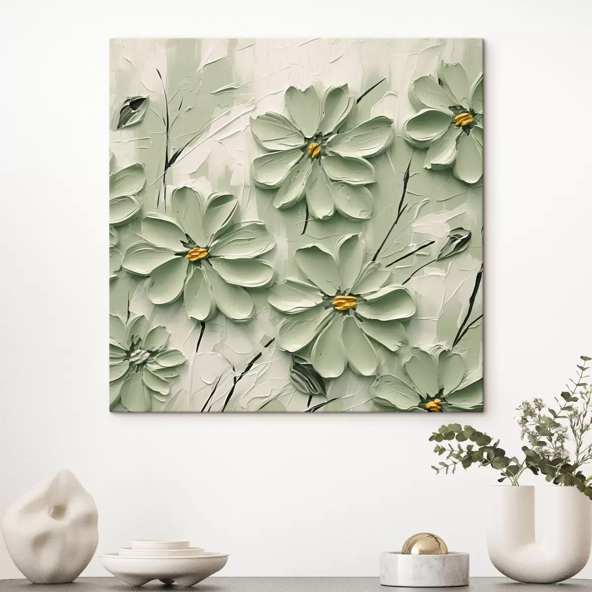 Obraz Zelené kvety so žltými stredmi namaľované hustými ťahmi štetca na svetlom pozadí Nr. s45265
