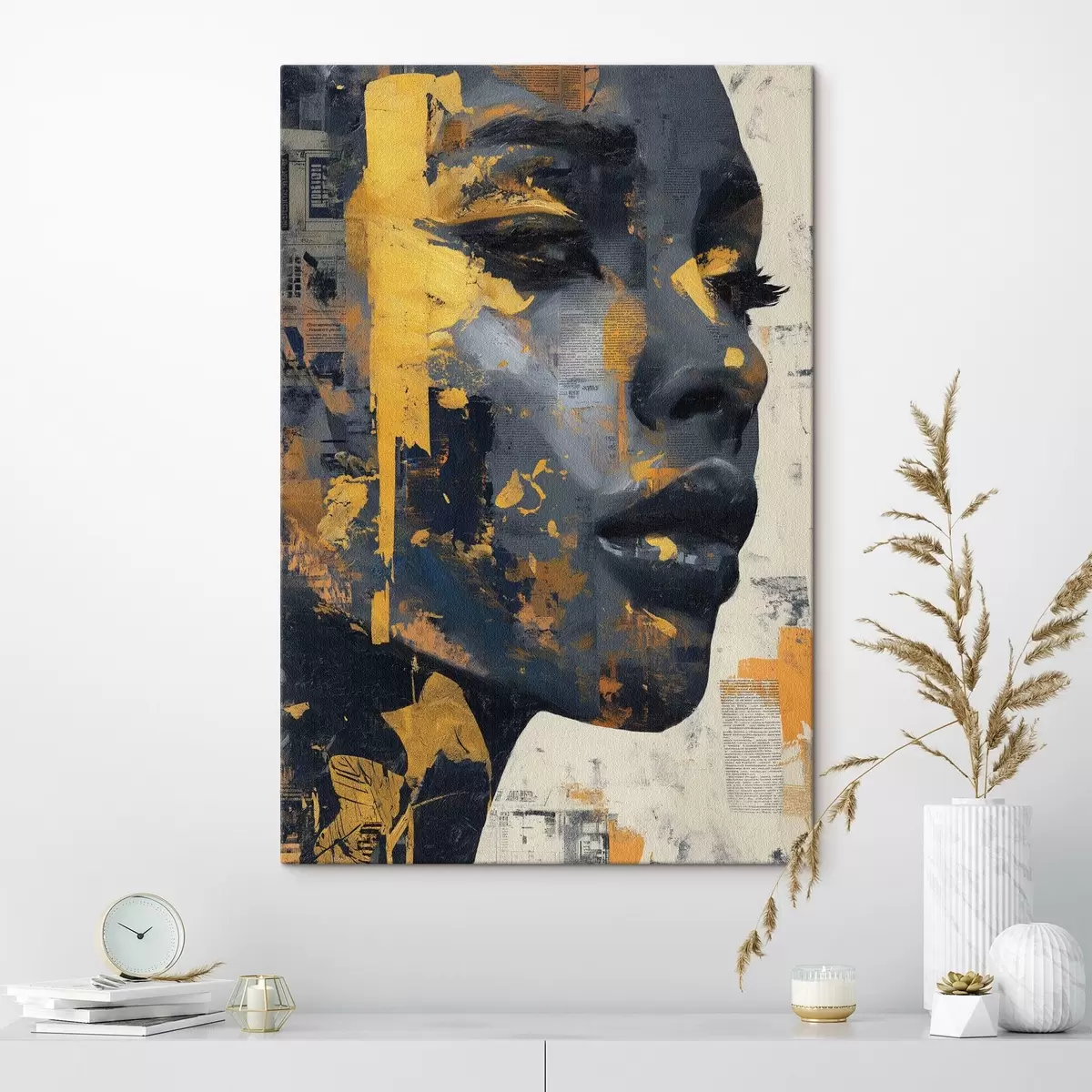 Obraz Portrét v zmiešaných médiách s fragmentmi novín a dekoratívnymi ťahmi štetca Nr. s45420