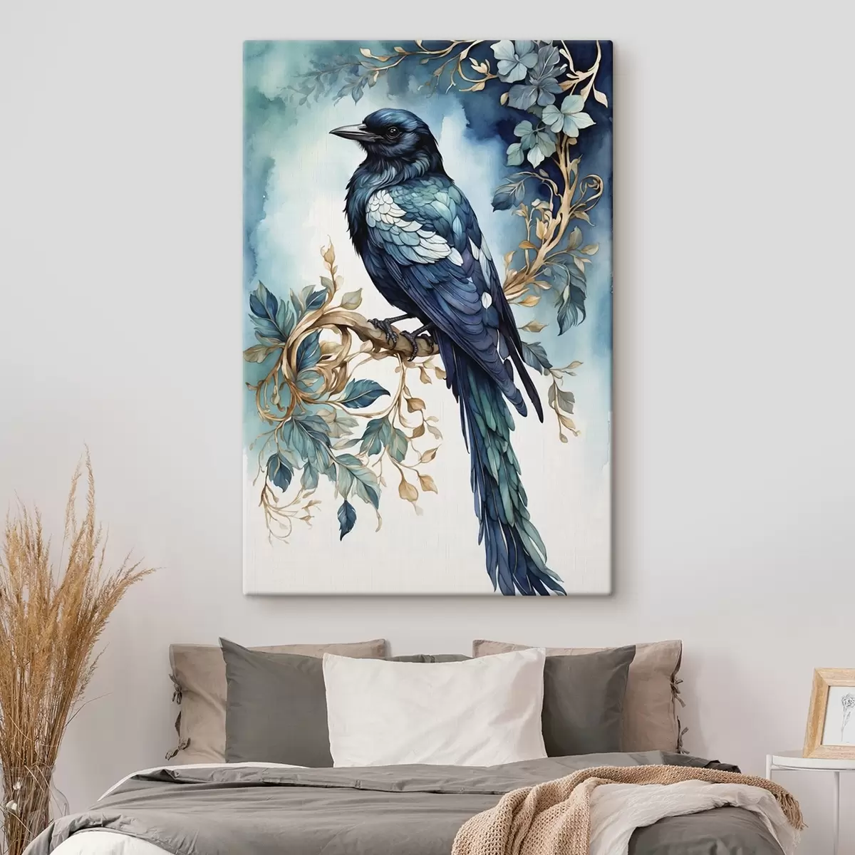 Obraz Modrý vták na vetve s akvarelovými listami Nr. s45483
