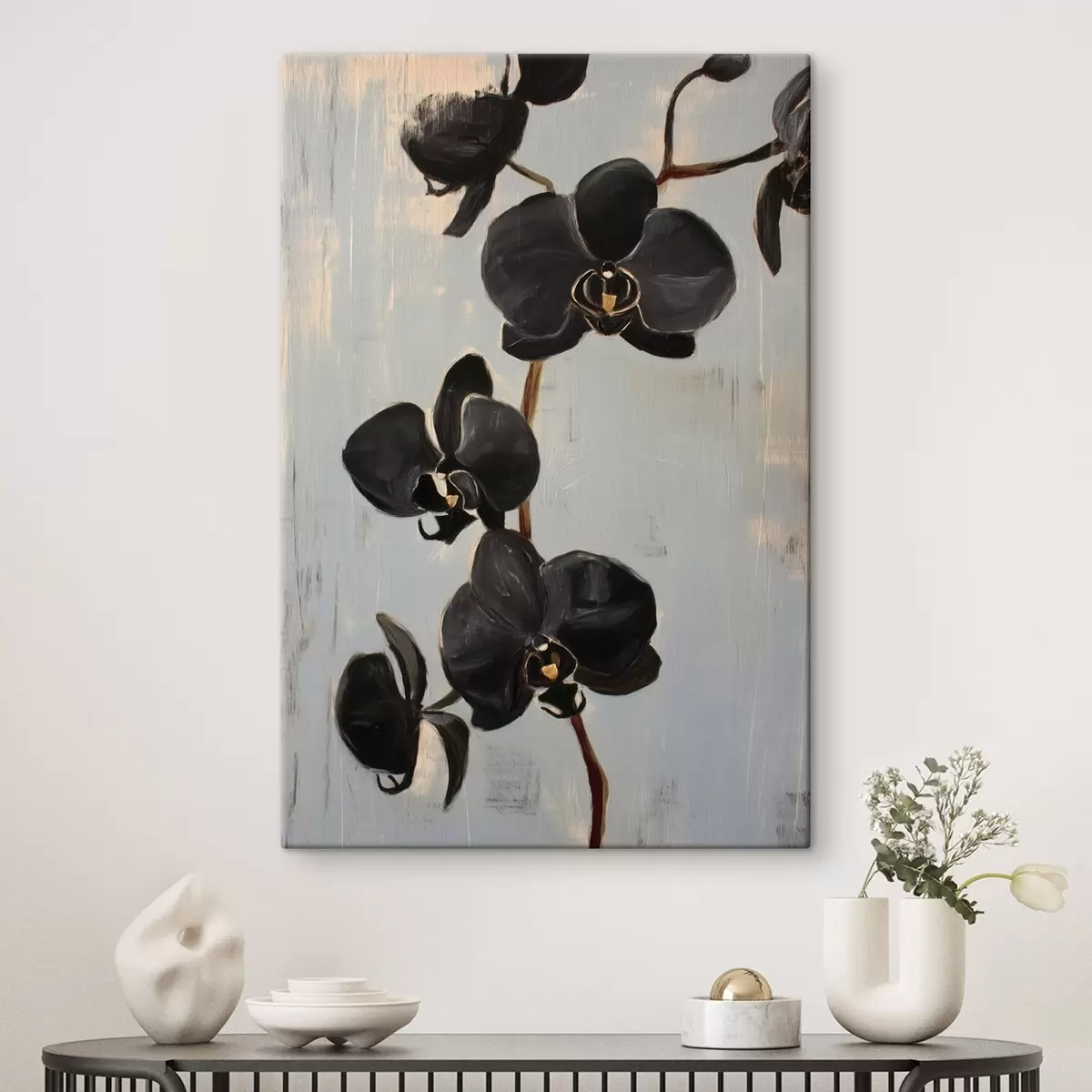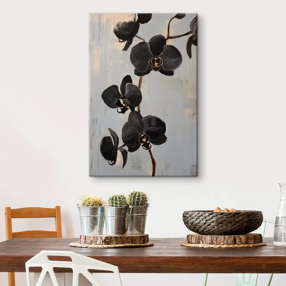 Obraz Dekoratívne orchidey: čierne kvety na sivom pozadí Nr. s45547